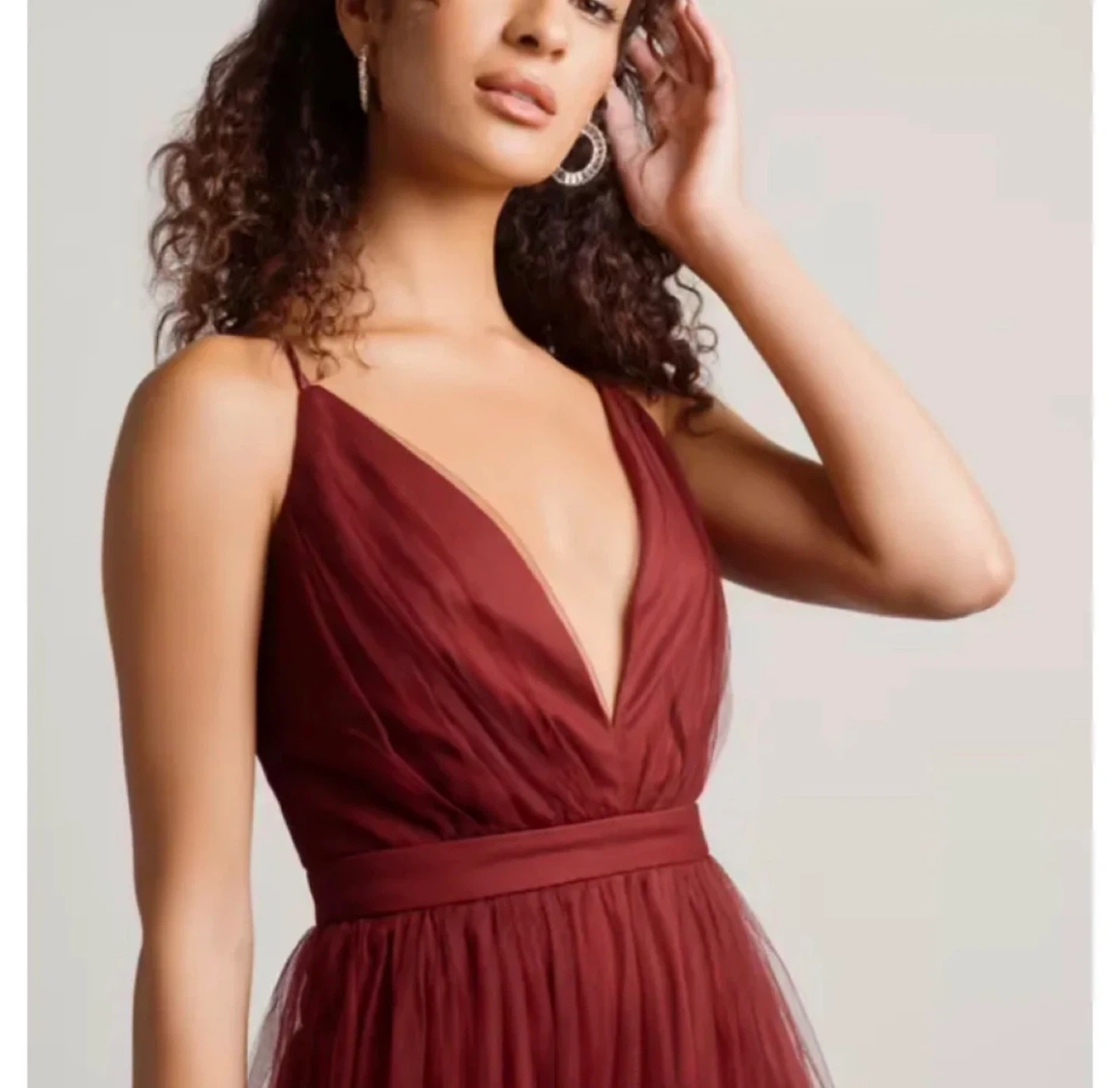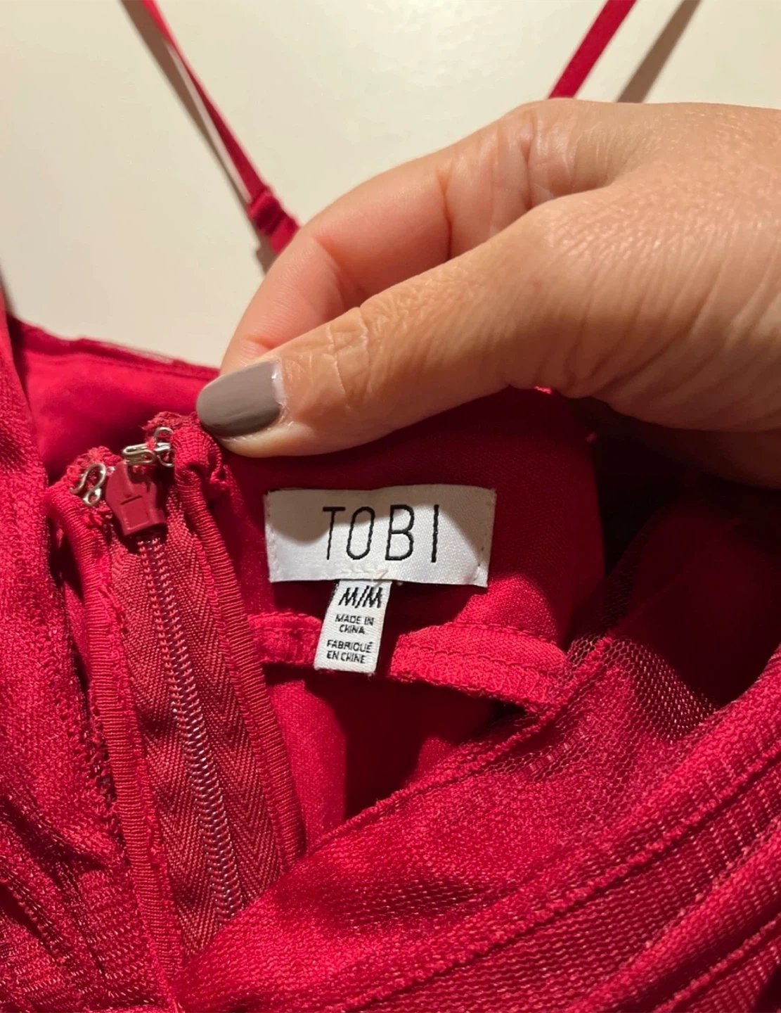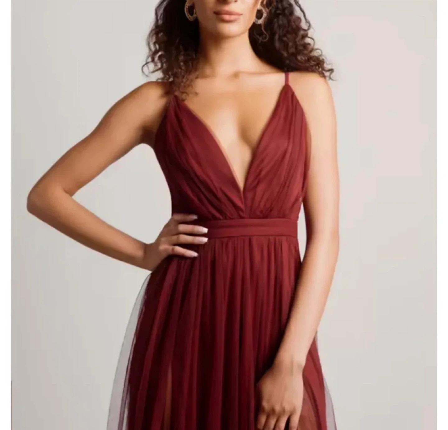 Stunning TOBI red maxi dress with a deep V-neck and crisscross back straps. It's made of a sheer tulle overlay. The M/M size is perfect for formal events. This maxi dress features adjustable straps, slit and a back zipper closure. Complete this flowy maxi dress with a clutch and heels for an elegant wedding guest, holiday party, gala or prom night look.