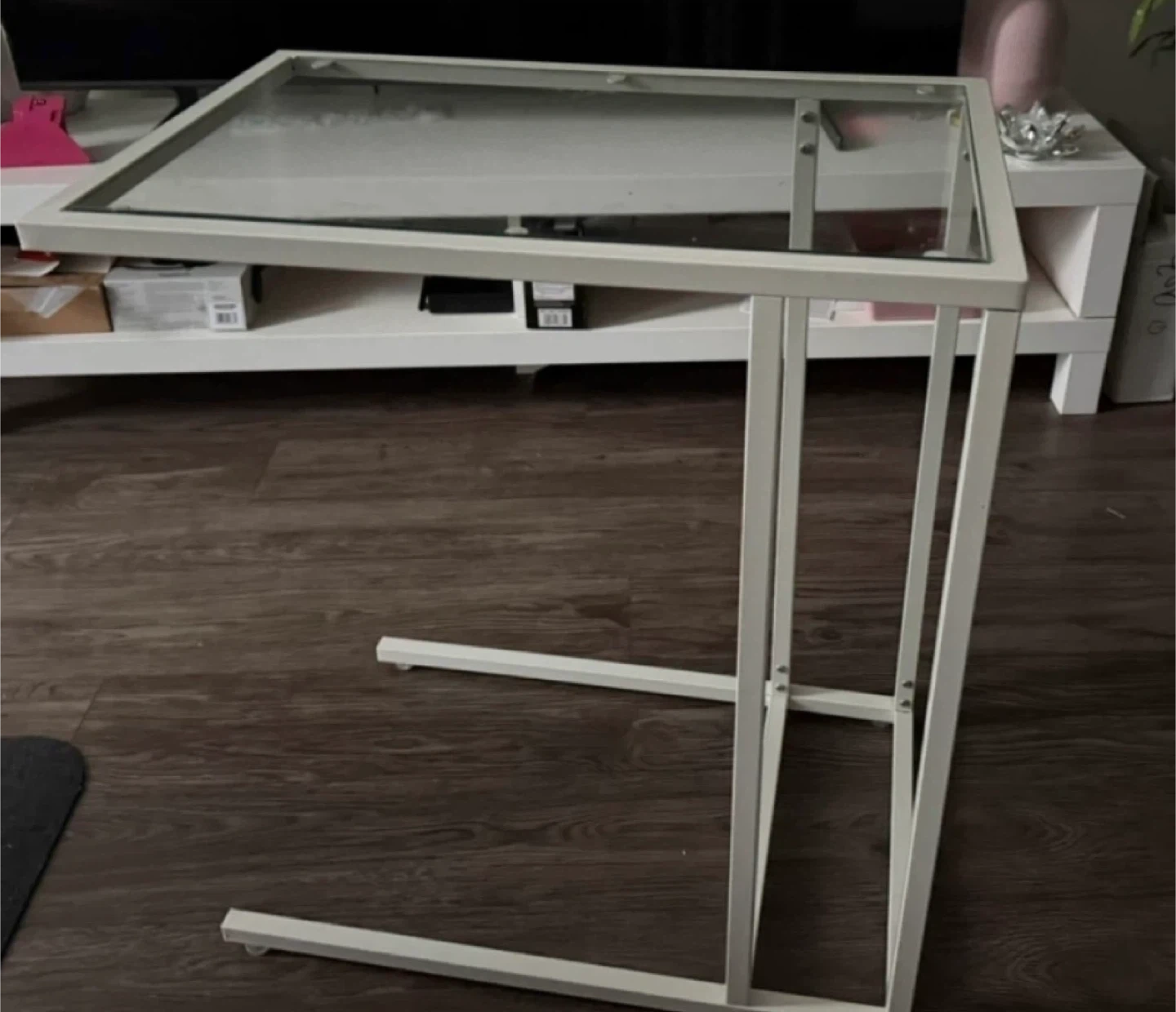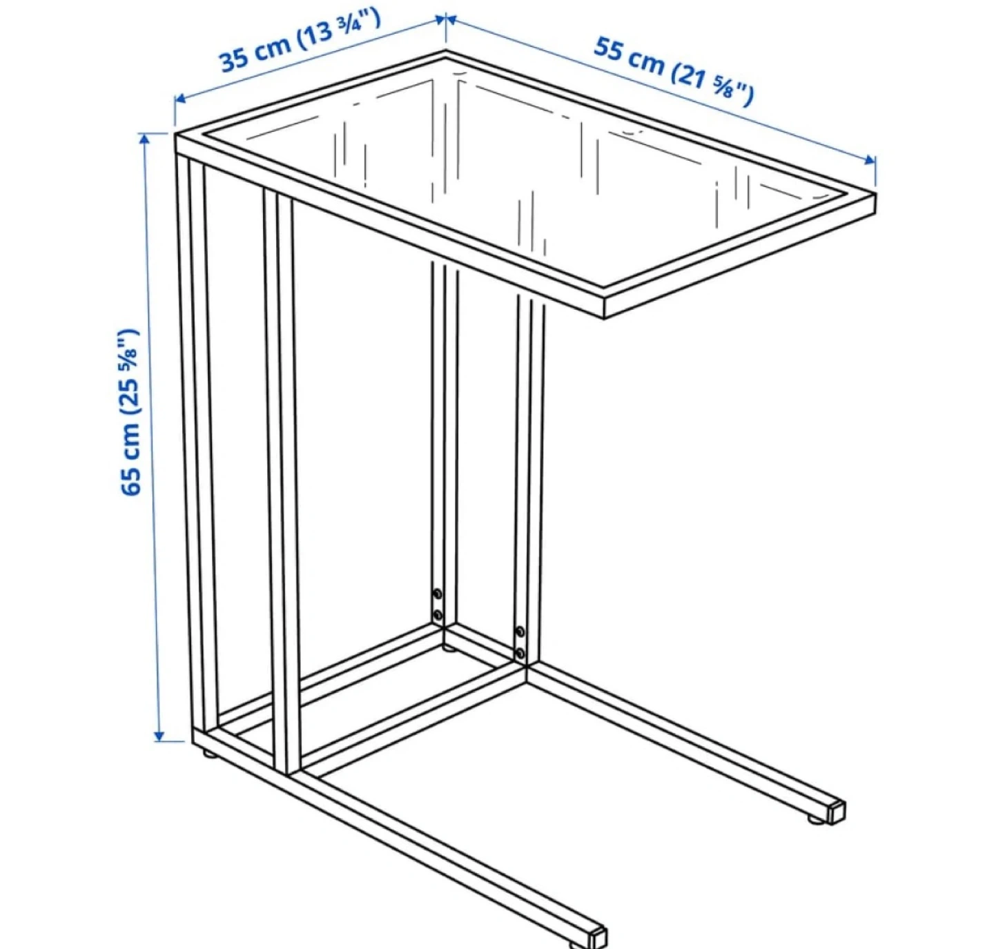 This is a white IKEA Glodde side table. It has a glass top and metal frame. Dimensions are 65 cm height, 55 cm width, and 35 cm depth. It's handy for placing a laptop or drinks next to a couch or chair.