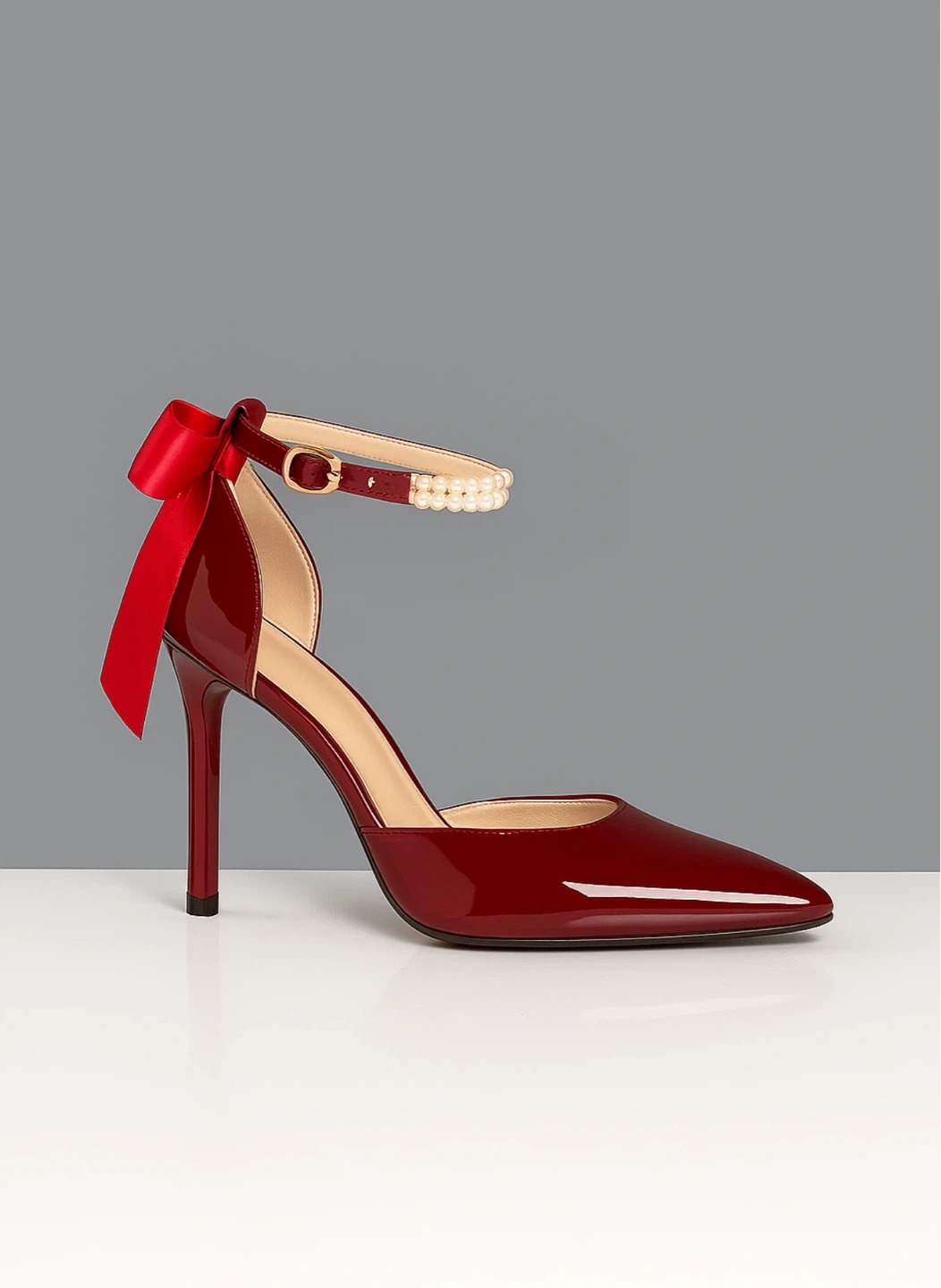 Elegant and aesthetic red stiletto heels featuring a delicate ankle strap adorned with faux pearls and a cute ribbon detail. Perfect for adding a pop of colour to any outfit!