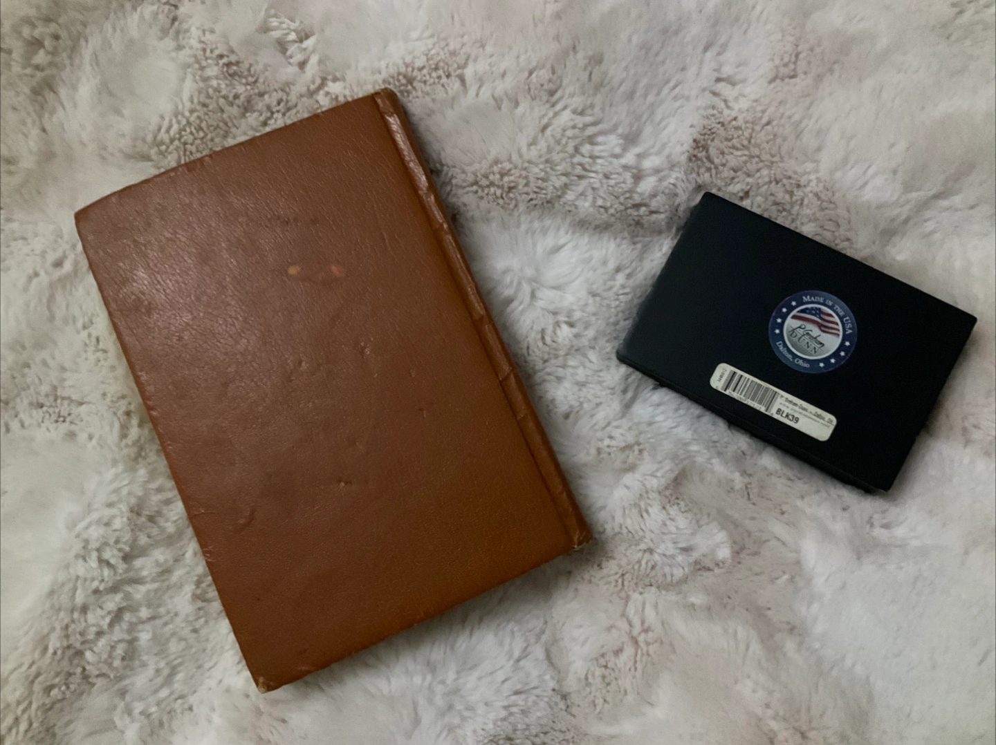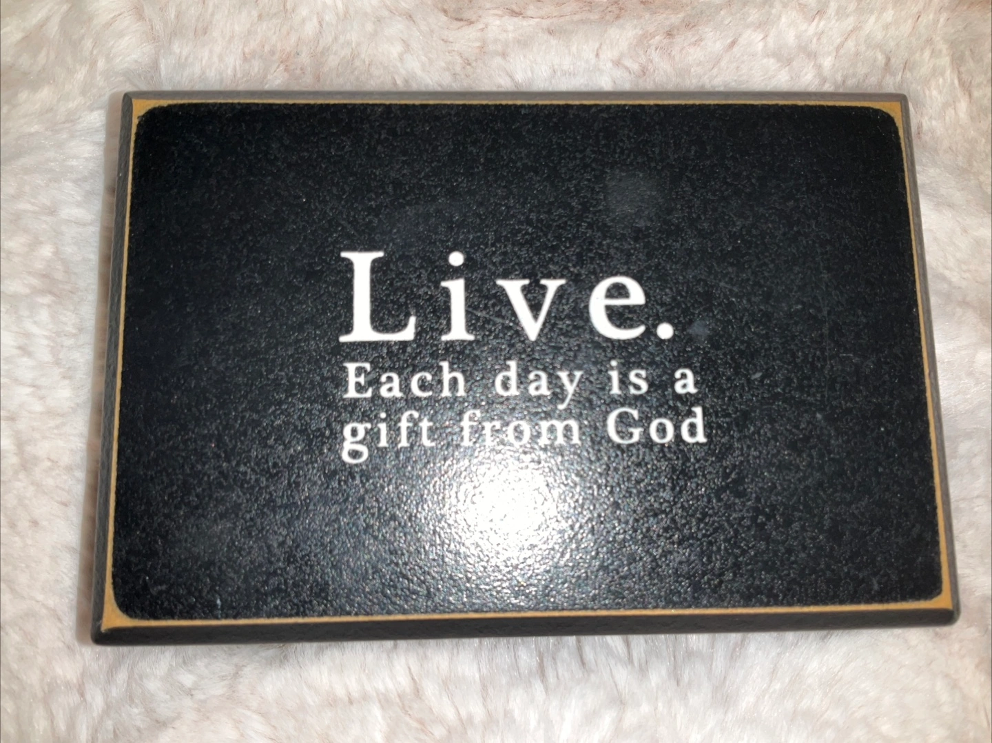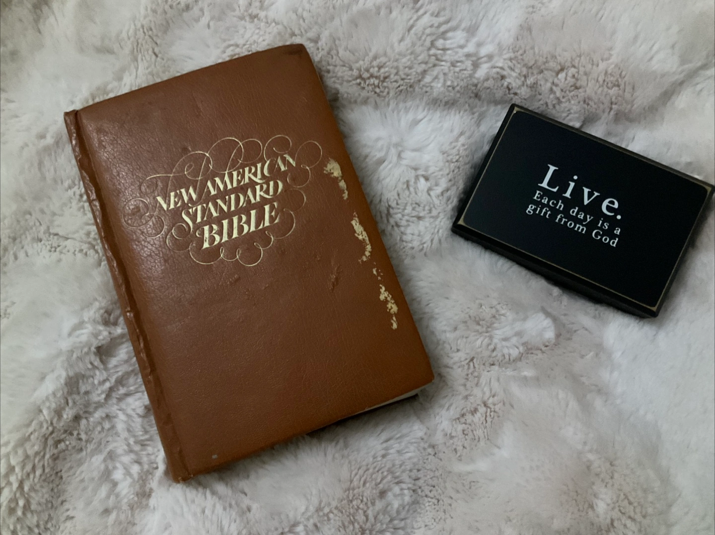 Vintage new American standard bible and Small rectangular wooden plaque for desk or shelf. Black background with white lettering. Says "Live. Each day is a gift from God". Gold coloured border. Made in the USA.