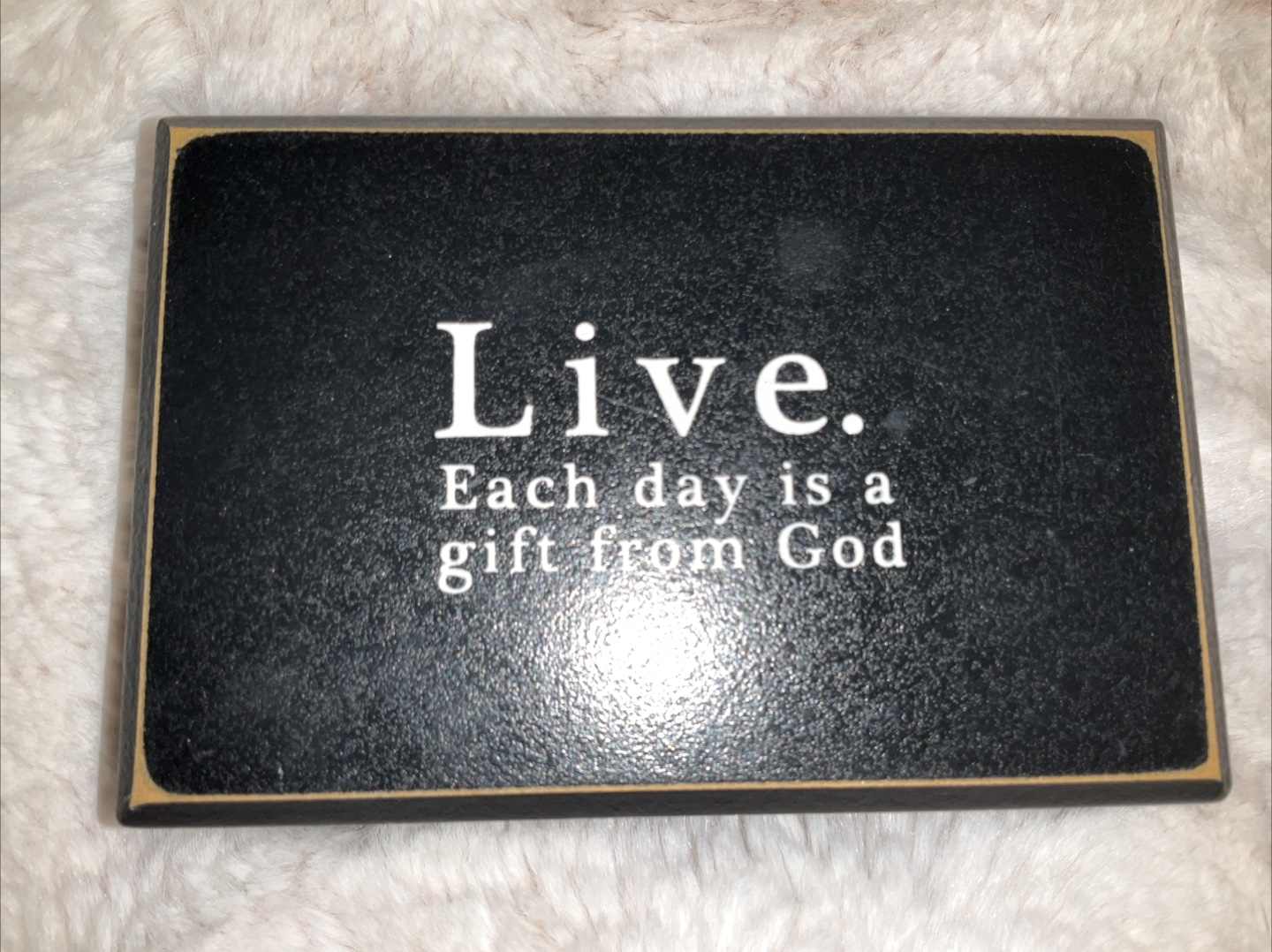 Vintage new American standard bible and Small rectangular wooden plaque for desk or shelf. Black background with white lettering. Says "Live. Each day is a gift from God". Gold coloured border. Made in the USA.