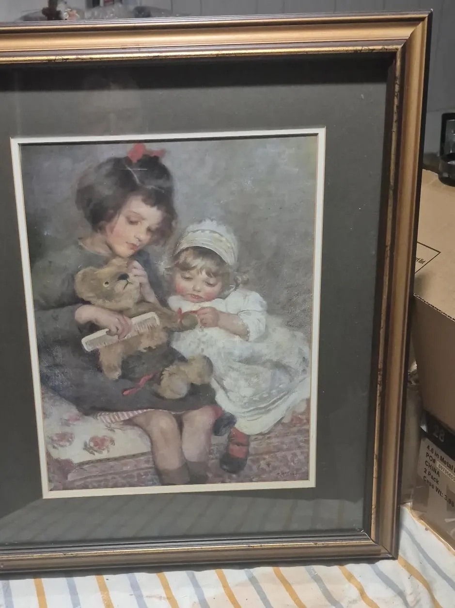A framed print featuring two children with a teddy bear. The frame is gold-toned and the print is in good condition. It would look lovely in a child's room or nursery