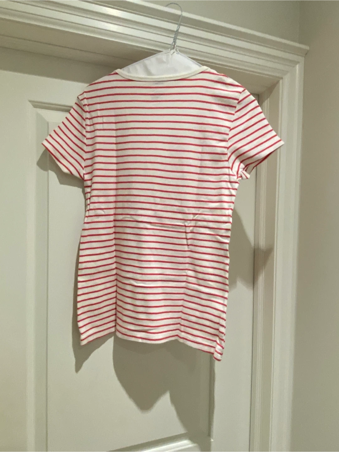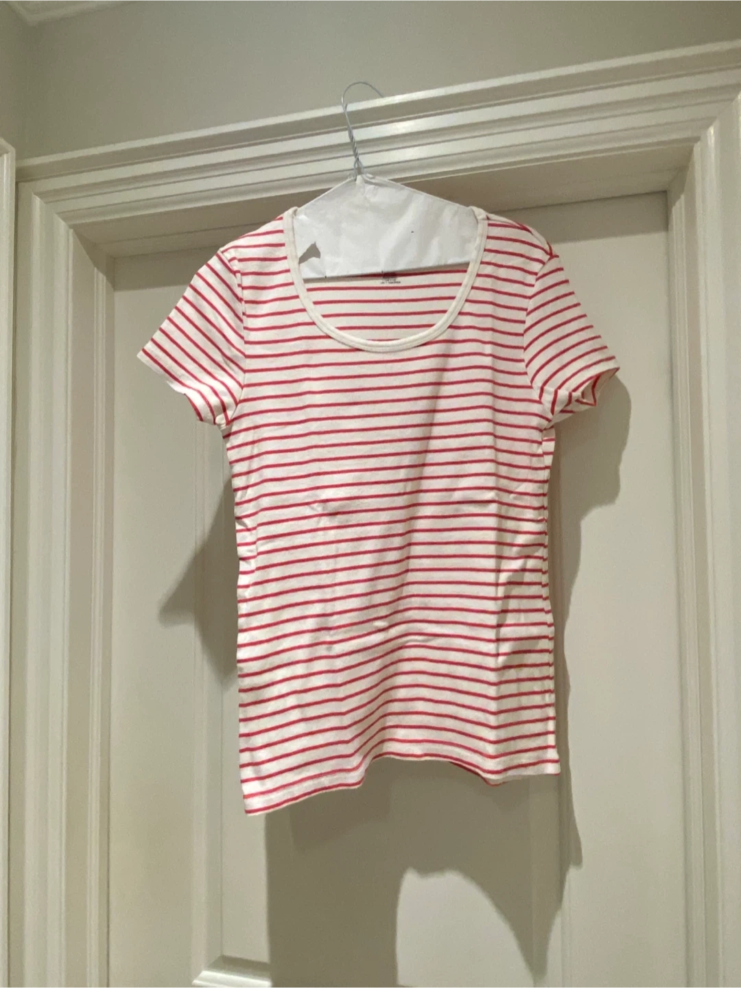A classic red and white striped t-shirt with a scooped neckline. It's made of a soft cotton blend for everyday comfort. This tee is perfect for casual wear or layering.