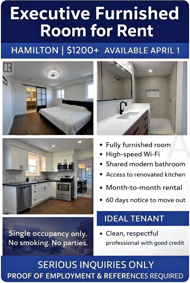 Bright, fully furnished executive bedroom available in a beautifully renovated home located in a quiet, safe Hamilton neighborhood. Ideal for a clean, respectful professional seeking a comfortable and peaceful living environment. The room features a modern bed, bedside table, large windows with natural light, and access to a stunning shared bathroom with a walk-in shower. The home also includes a newly updated kitchen with stainless steel appliances and a dining area. What’s Included: Fully furnished bedroom, High-speed Wi-Fi, Shared modern bathroom, Access to renovated kitchen and common areas, Quiet and well-maintained home. Rent: $1200/month + shared utilities. Available April 1. Month-to-month rental. 60 days notice required to move out. Parking may be available for an additional cost. This room is best suited for a working professional who values cleanliness, quiet living, and mutual respect within the home. Requirements: Proof of employment or stable income, Good credit, References (previous landlord or professional), First and last month’s rent. Single occupancy only. No smoking. No parties. Serious inquiries only. If the ad is up, the room is still available. Please include a short introduction about yourself when replying. Please text for a faster response.