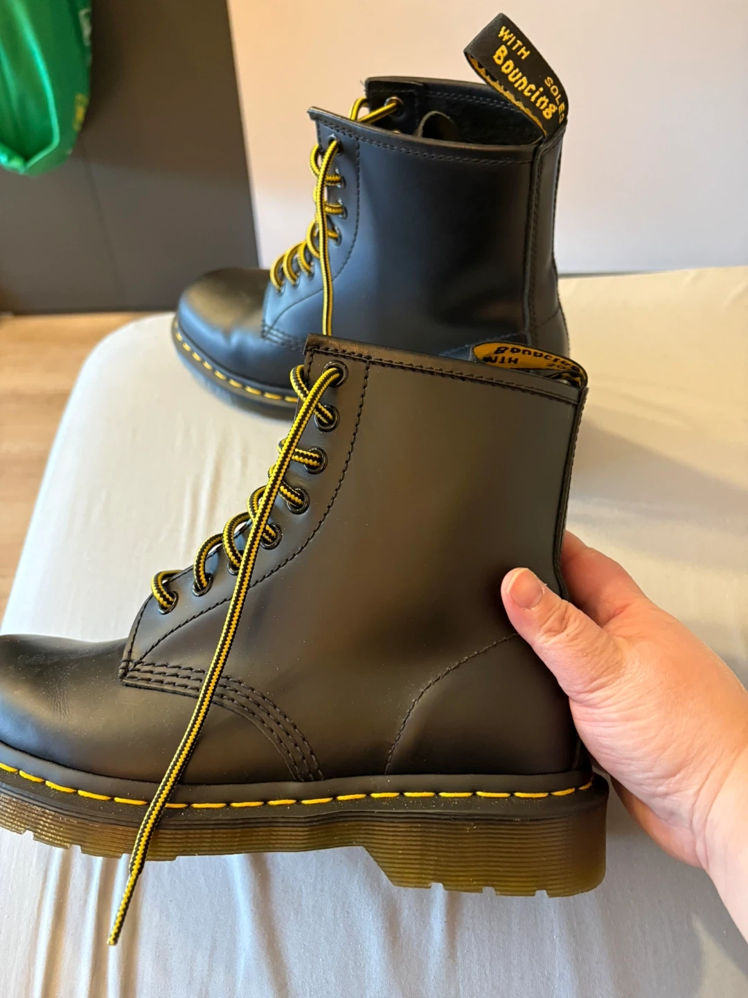 These are UK size 6 black smooth leather Dr. Martens 1460 shoes. They're skillfully made and have the iconic yellow stitching. The sole is made of air-cushioned rubber for comfort. A classic style that's built to last! Worn only once for 5 minutes and realized they are good shoes but just not for me :(