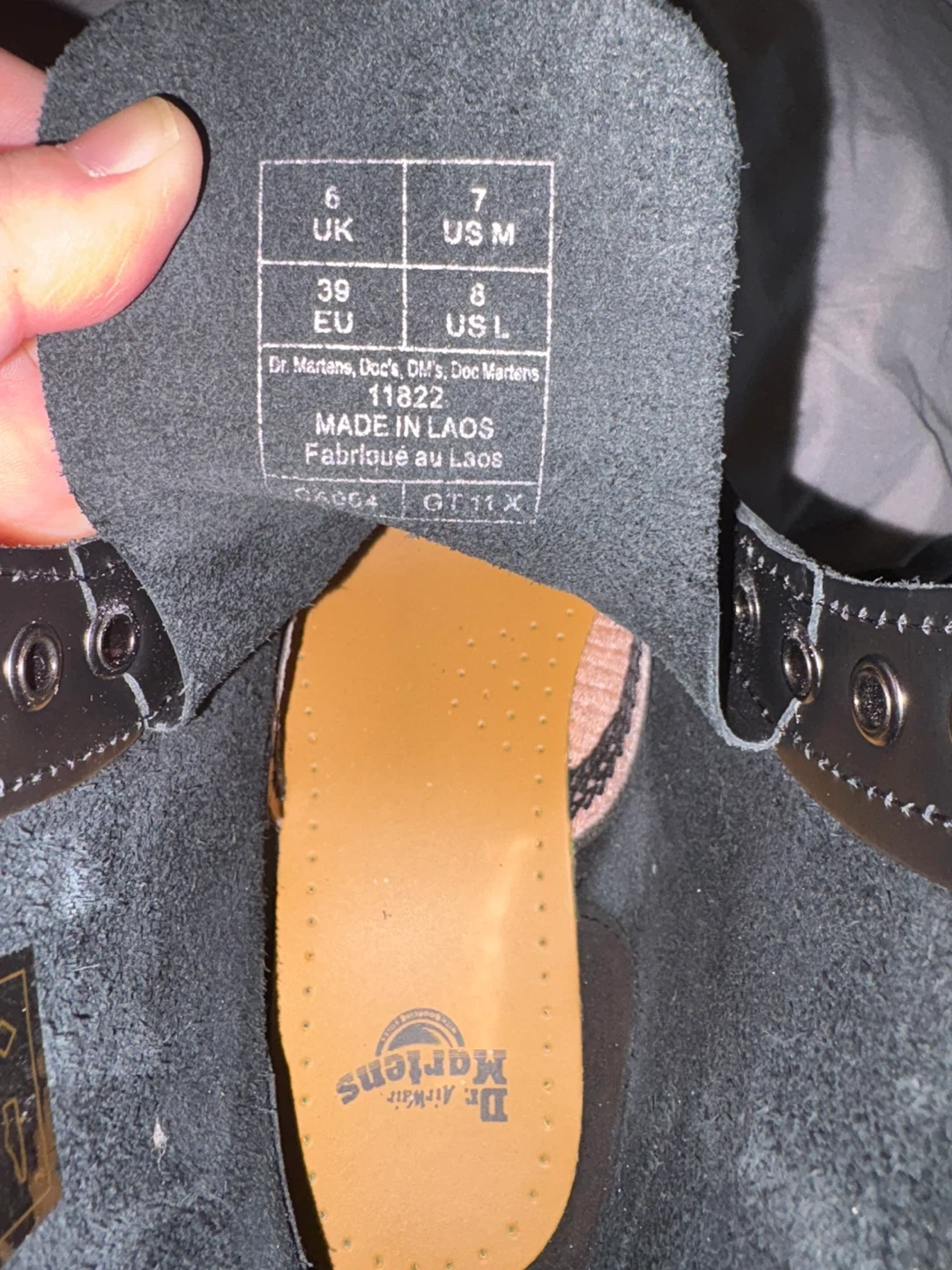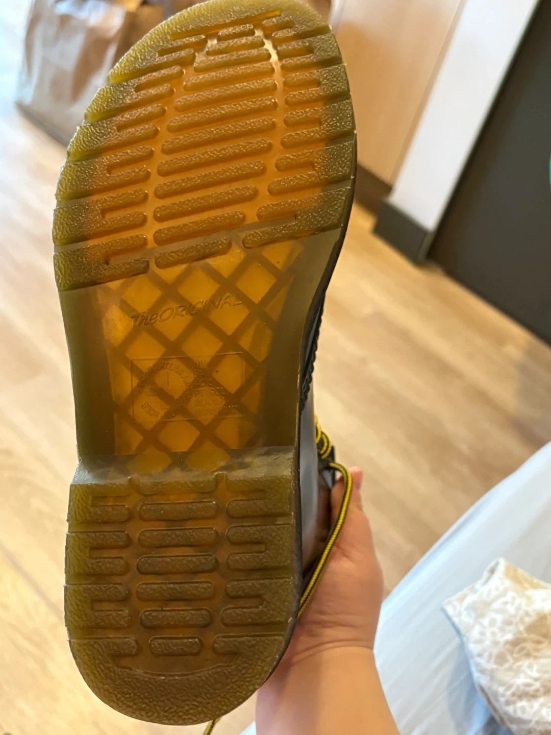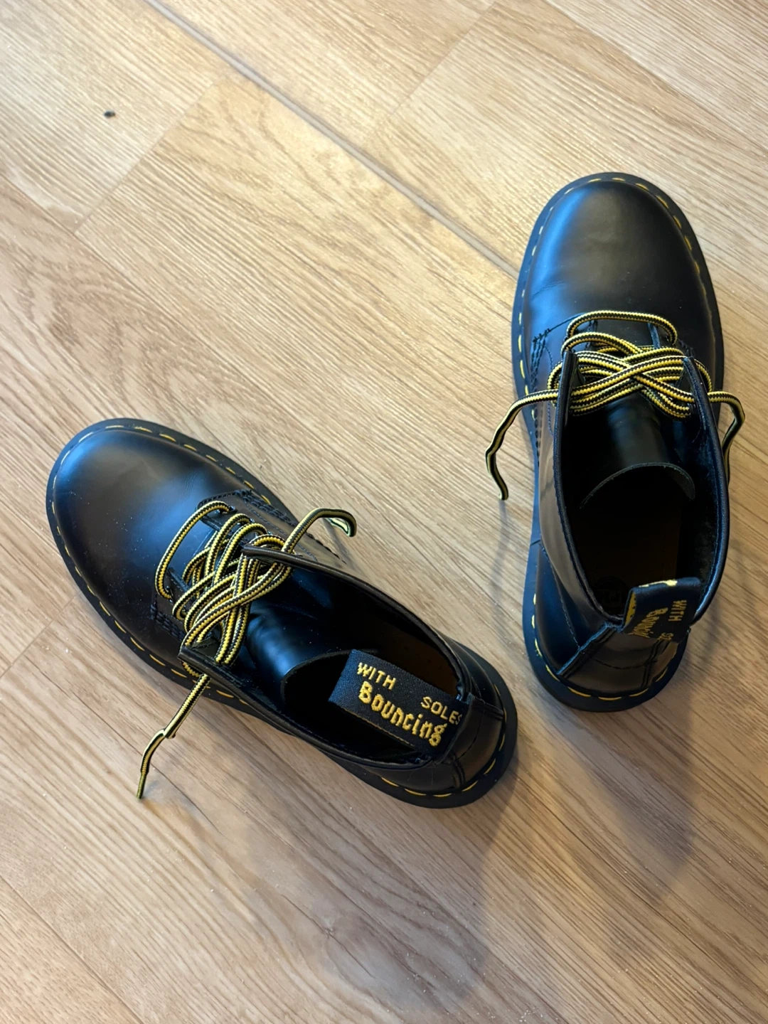 These are UK size 6 black smooth leather Dr. Martens 1460 shoes. They're skillfully made and have the iconic yellow stitching. The sole is made of air-cushioned rubber for comfort. A classic style that's built to last! Worn only once for 5 minutes and realized they are good shoes but just not for me :(