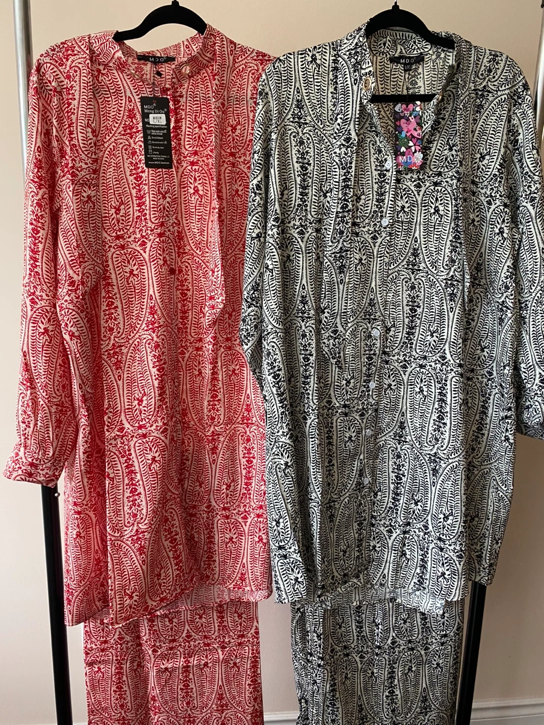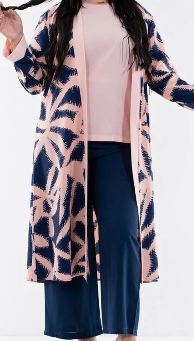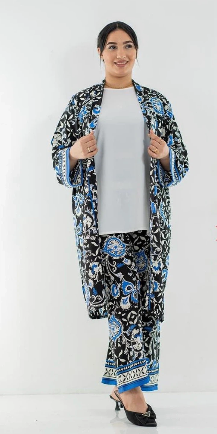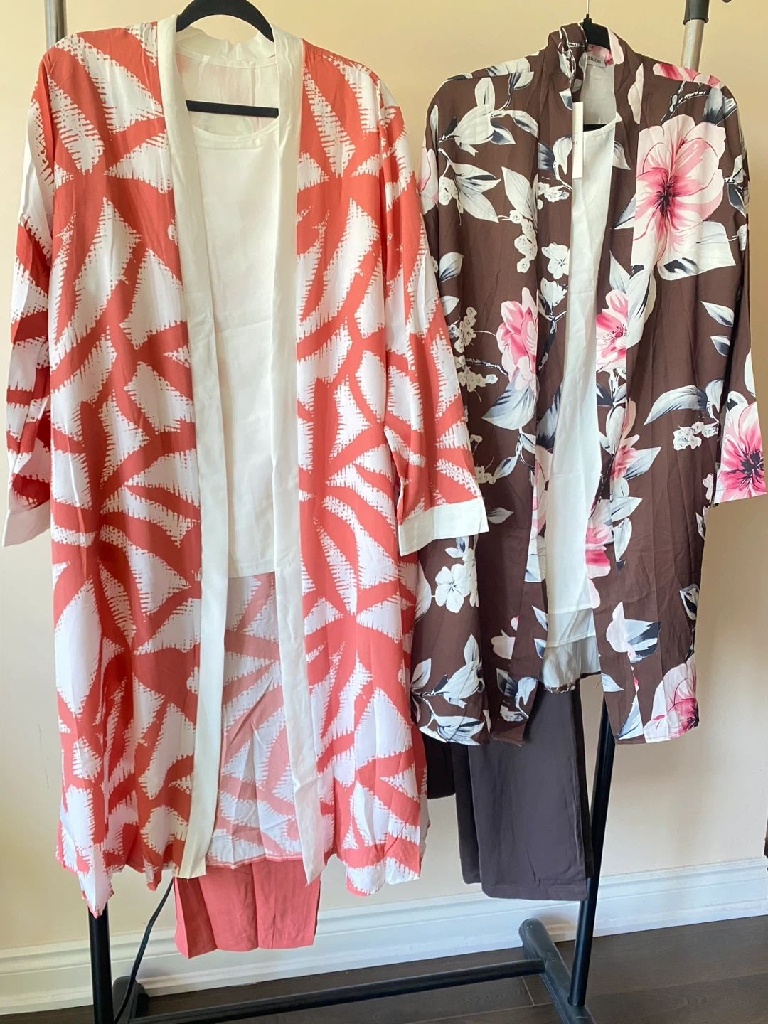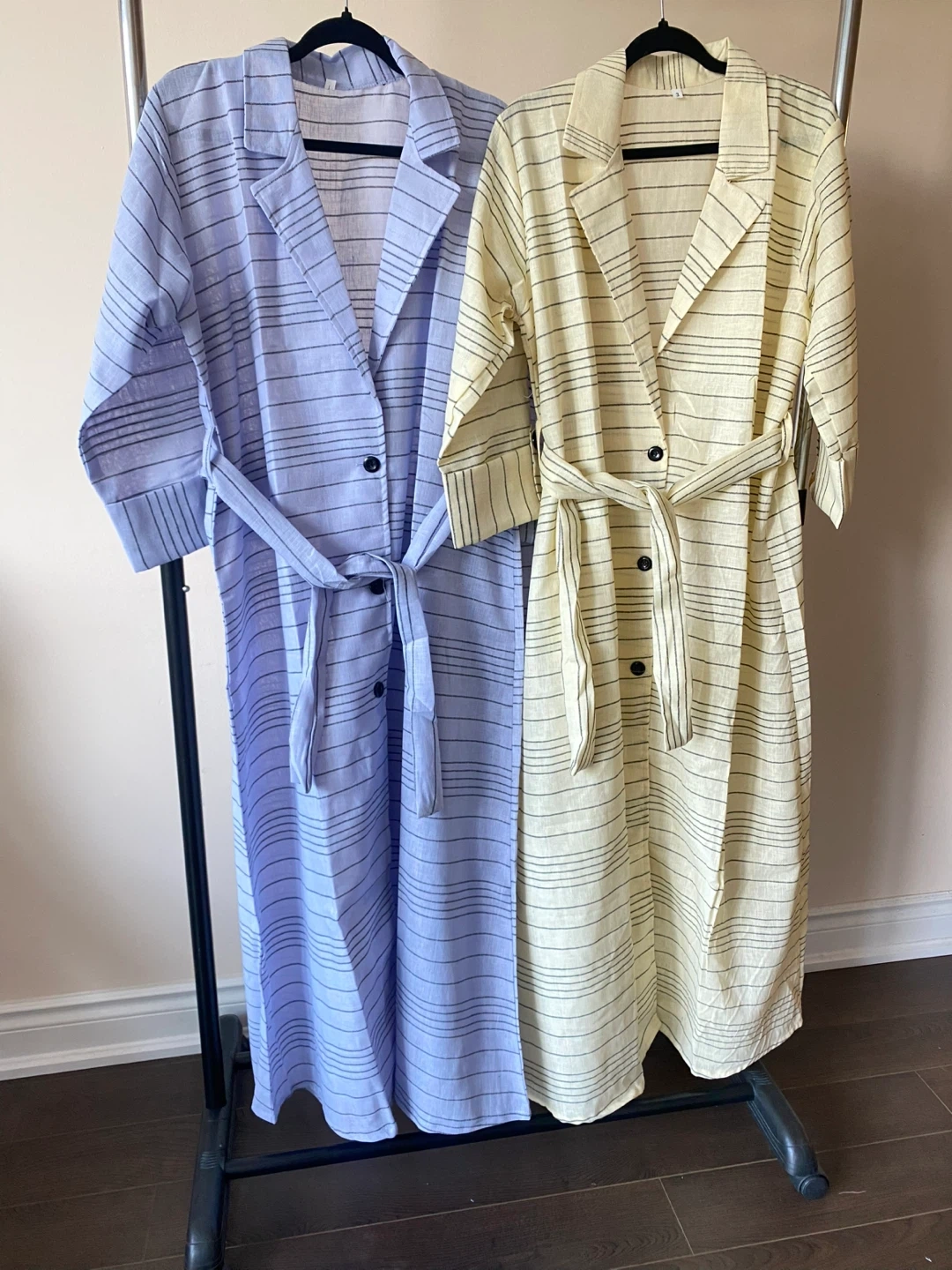 Two long duster jackets in light blue and yellow, both featuring a subtle stripe pattern and a tie belt. They're perfect for layering over any outfit. Material appears to be lightweight fabric.