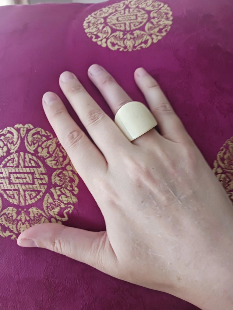 Selling a unique vintage bone ring! It has a smooth, rounded dome shape and a comfortable fit. The ring is made of a creamy off-white bone. It's a statement piece that would add a touch of vintage charm to any outfit