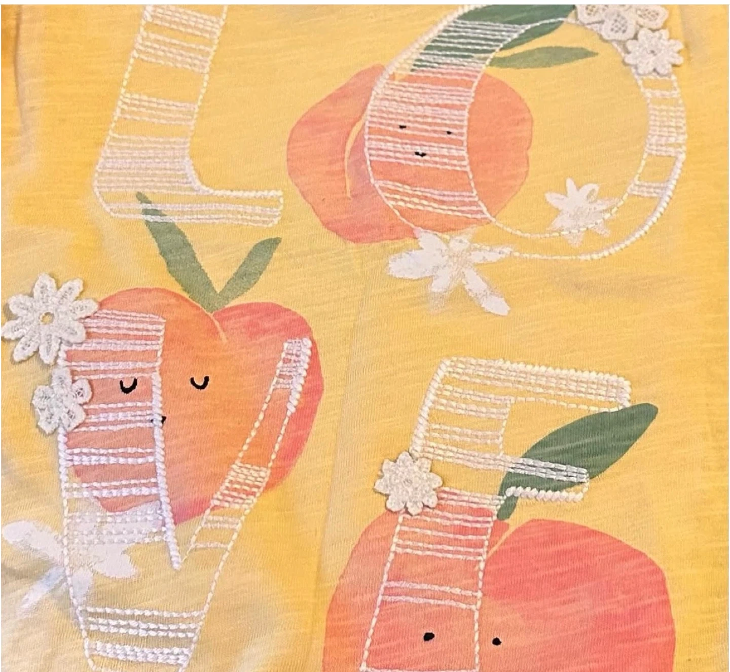 This is a cute OshKosh B'gosh t-shirt for toddlers. It's yellow with a "Love" graphic featuring cartoon peaches and apples. This shirt is sizes:2T & 4T made of soft cotton, perfect for everyday wear.