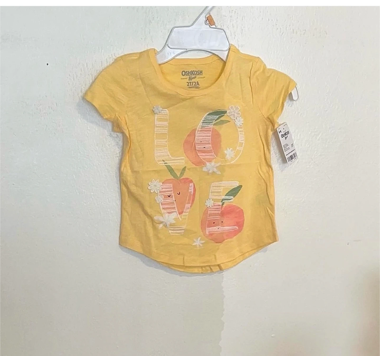 This is a cute OshKosh B'gosh t-shirt for toddlers. It's yellow with a "Love" graphic featuring cartoon peaches and apples. This shirt is sizes:2T & 4T made of soft cotton, perfect for everyday wear.