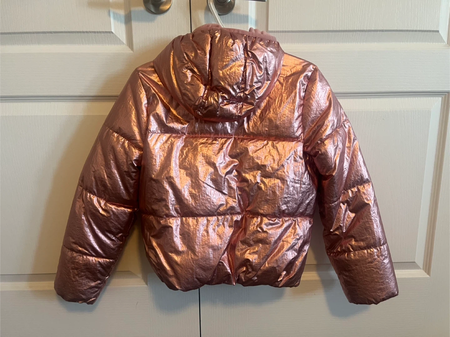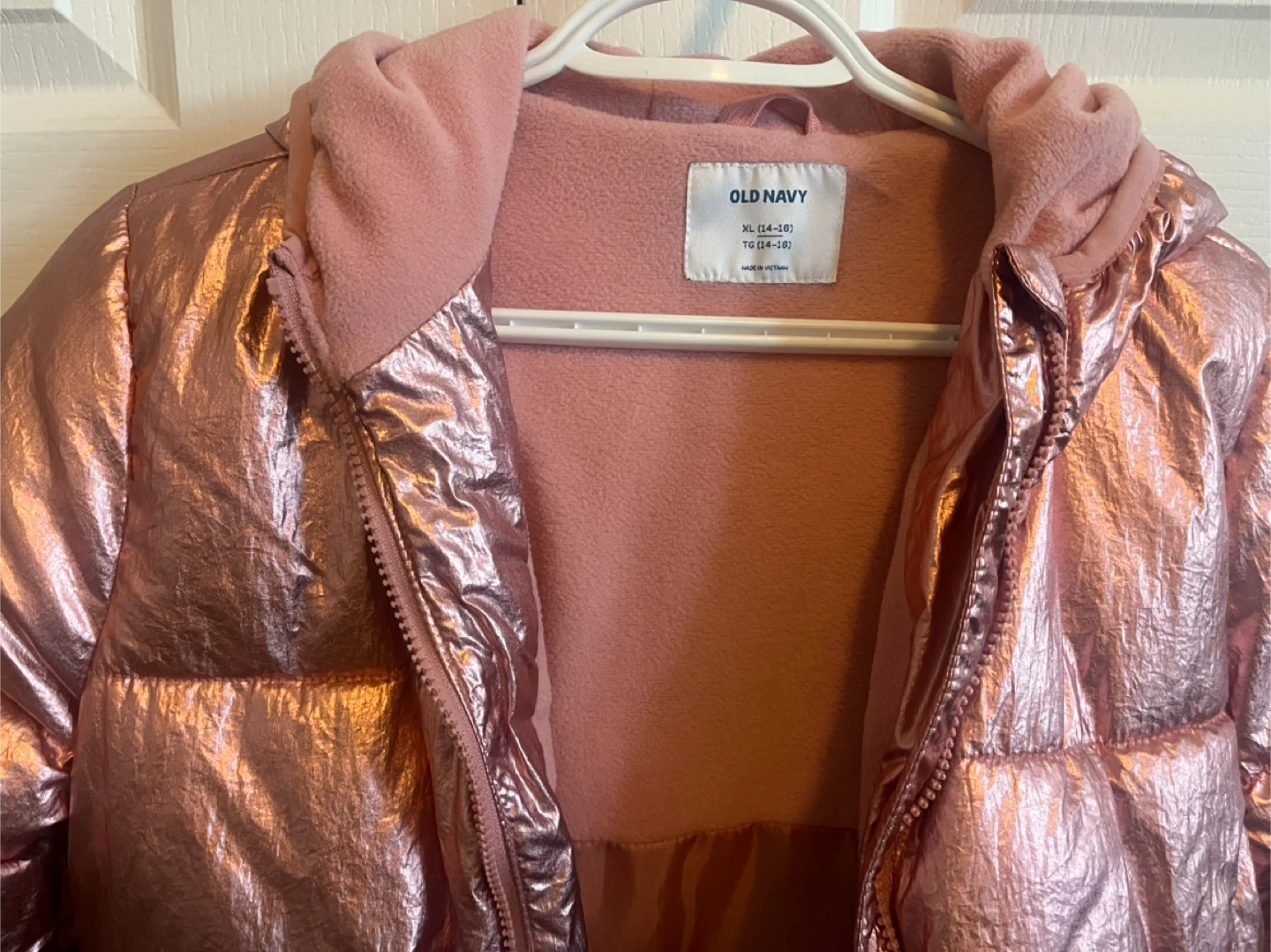 Selling a cute Old Navy puffer jacket in a rose gold colour! It's an XL (14-16). Great for keeping warm and stylish during the colder months