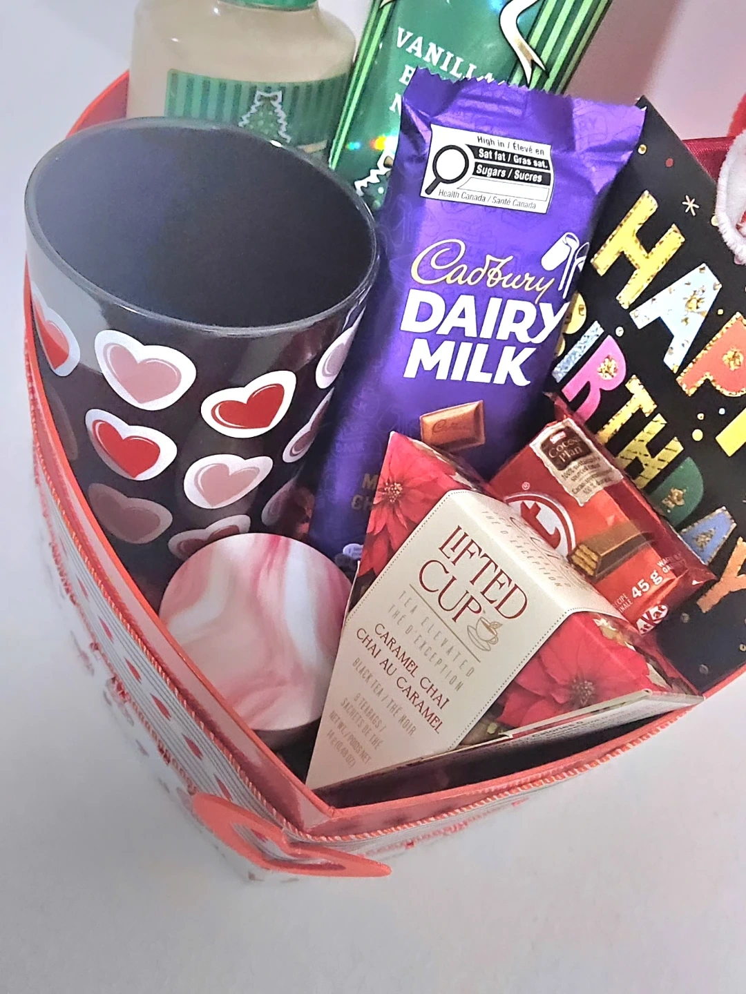 This gift box is packed with goodies for a special birthday celebration. It includes a soft plush, assorted chocolates and a selection of tea, along with a products from Bath & Body Works. A festive mug, scented candle and a 'Happy Birthday' card are also part of the set.