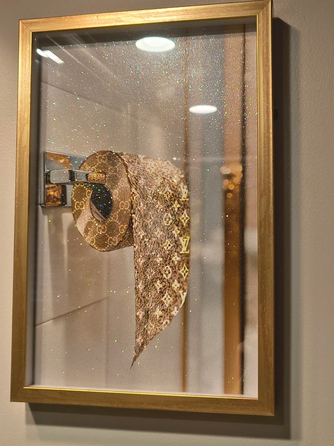 Unique framed art piece featuring a roll of toilet paper with designer logos. It's a statement piece for any room! Perfect for adding a touch of humour and luxury to your decor. With louis Vuitton and sparkles all over gorgeous!!!!