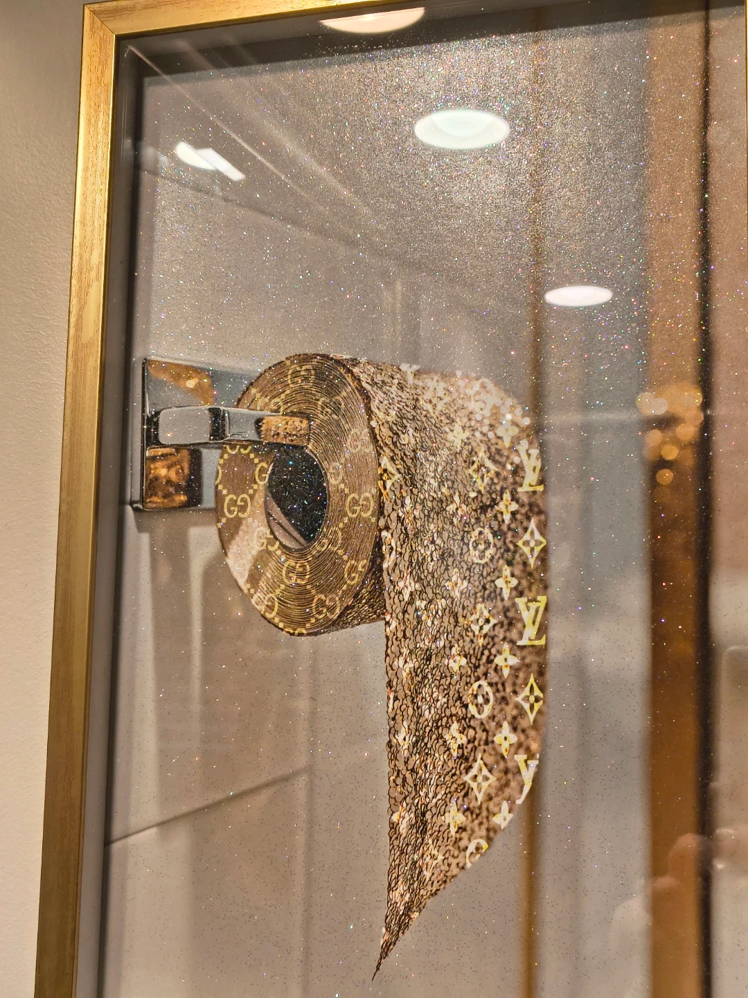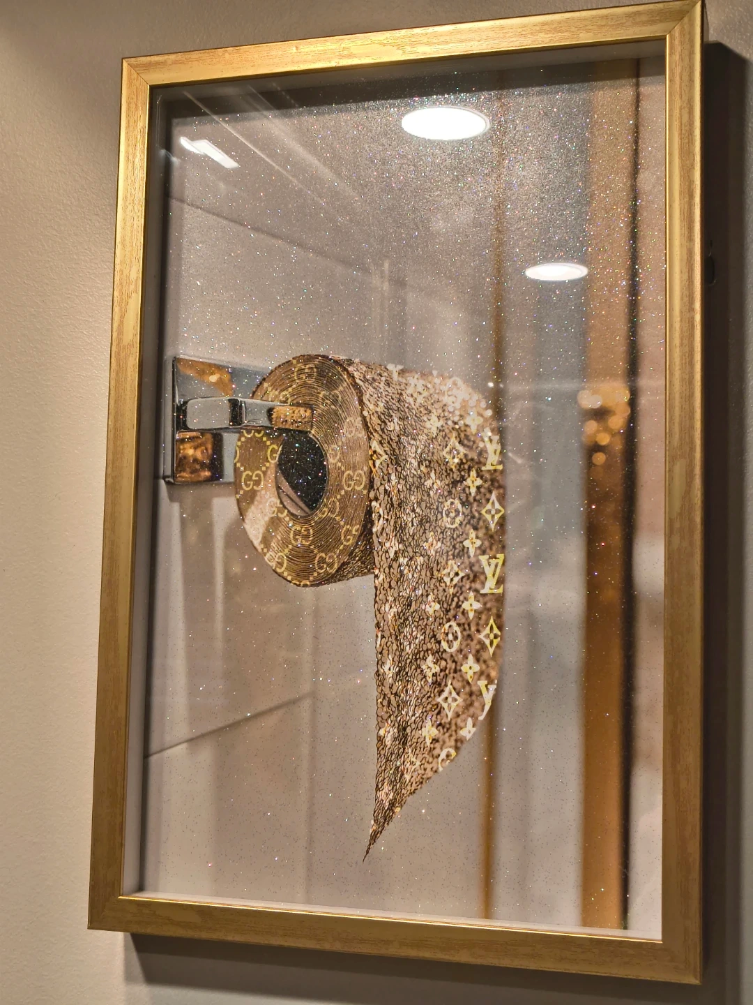 Unique framed art piece featuring a roll of toilet paper with designer logos. It's a statement piece for any room! Perfect for adding a touch of humour and luxury to your decor. With louis Vuitton and sparkles all over gorgeous!!!!
