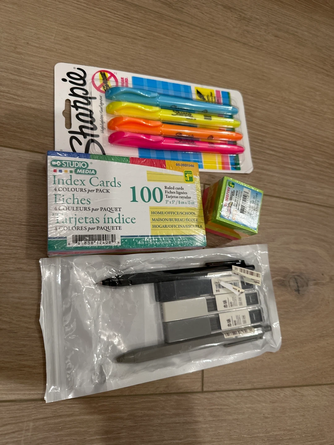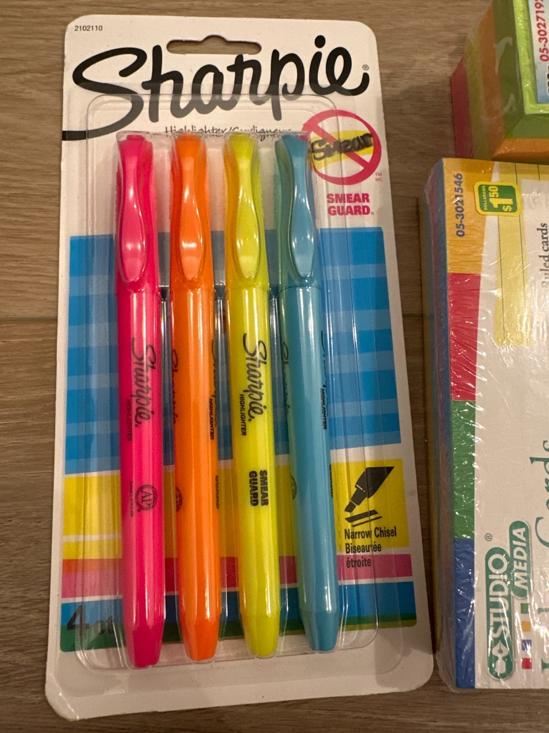 Includes a 4-pack of Sharpie highlighters and a set of pencil leads. The highlighters have narrow chisel tips and smear guard technology. Pencil leads are 0.5mm HB.