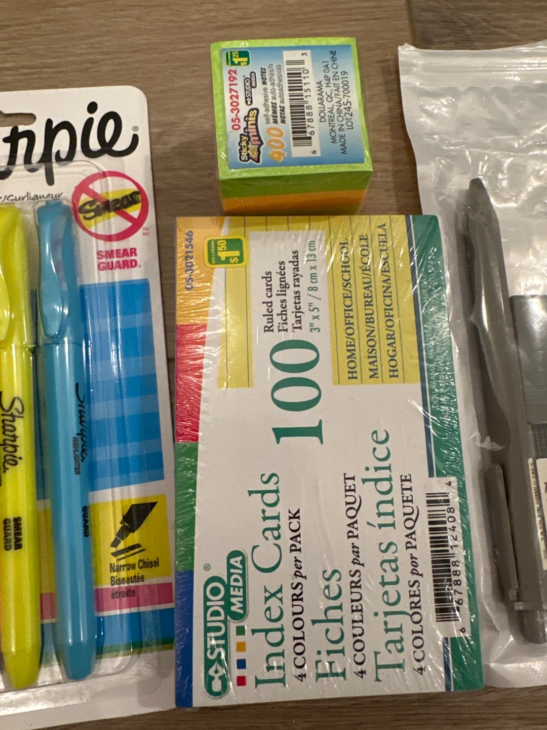 Includes a 4-pack of Sharpie highlighters and a set of pencil leads. The highlighters have narrow chisel tips and smear guard technology. Pencil leads are 0.5mm HB.