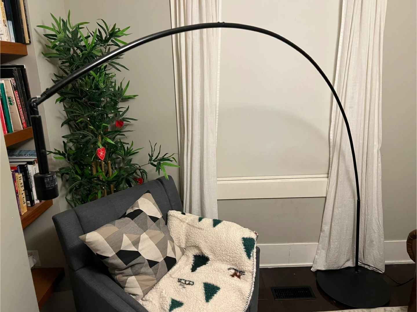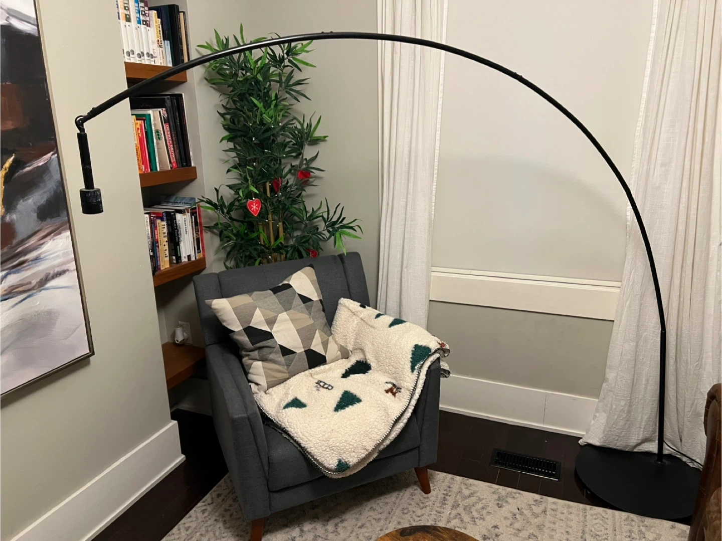 This black arc floor lamp provides adjustable lighting. It has a sturdy base and a long, curved arm. A great addition for reading nooks or living spaces!
