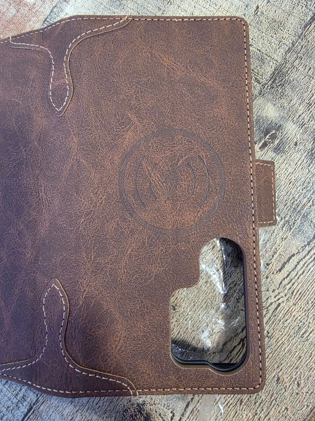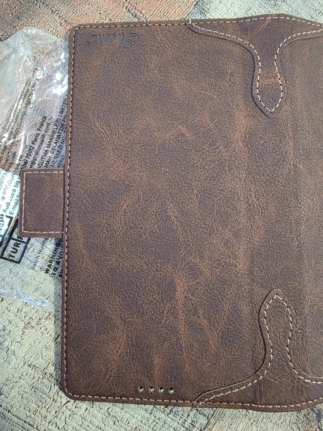 It's a stylish brown leather and has a magnetic closure.