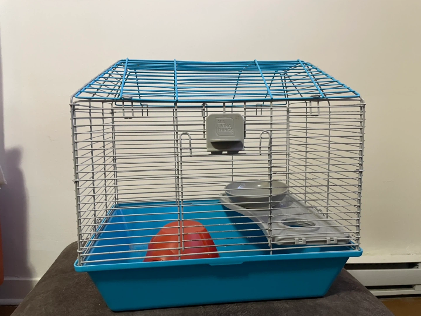 This is an All Living Things medium sized hamster cage. It comes with a blue base, wire top, food bowl, and a red hideout. The cage and the hide have a little damage, the bowl is brand new. Includes a ladder and a removable level. Perfect for your little friend🐹