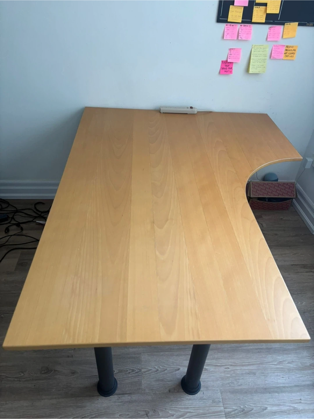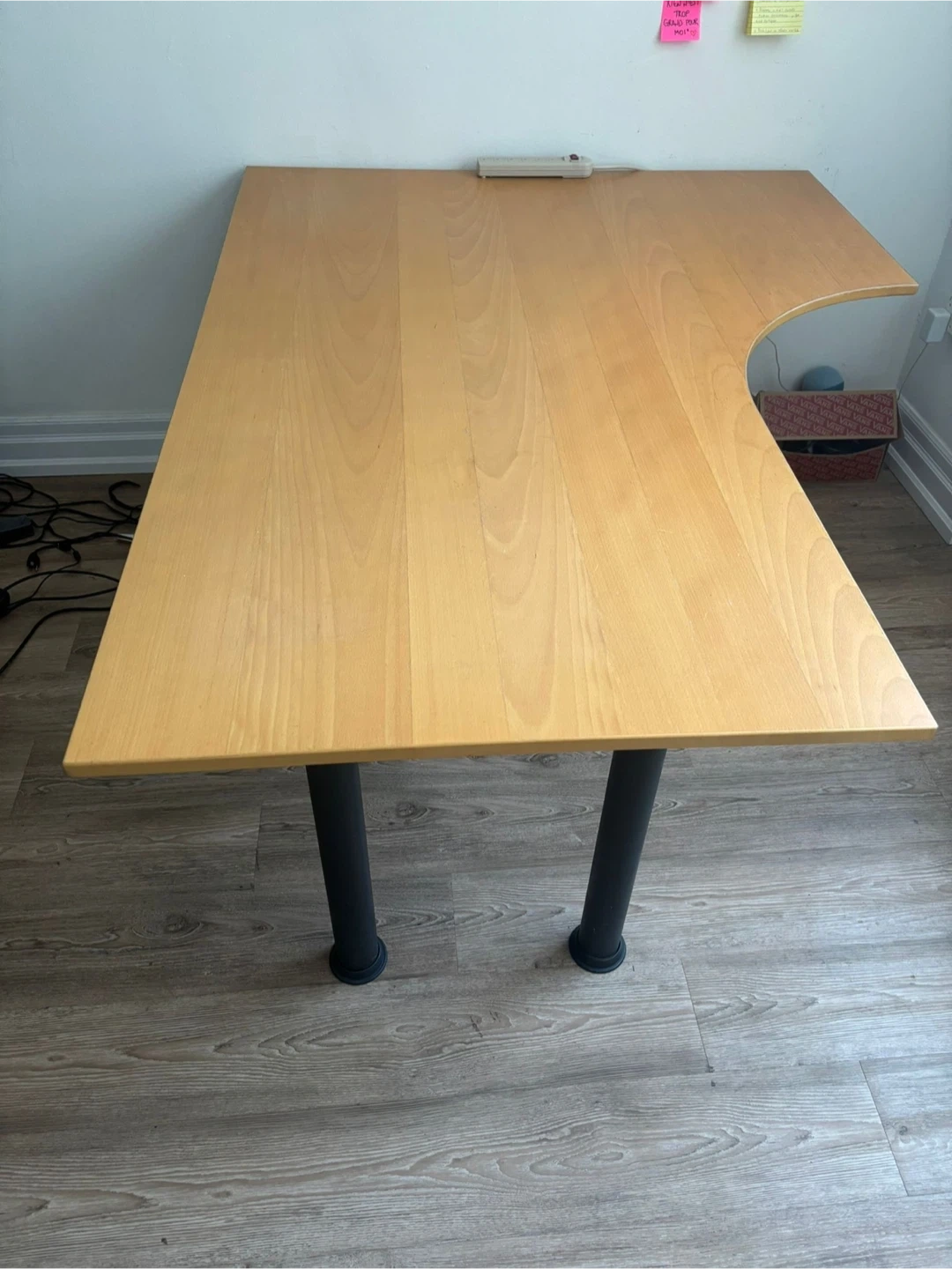 L-shaped corner desk with a natural wood finish. It's sturdy and offers a good amount of surface area. This desk is perfect for setting up a home office or workspace. It's ready for a new home!