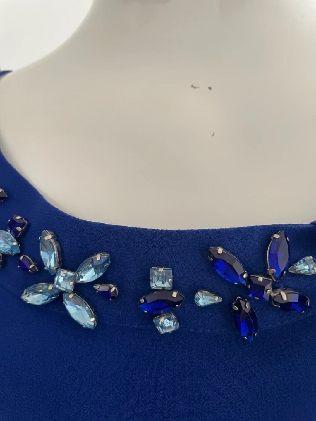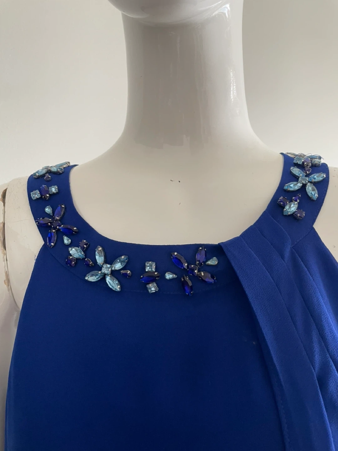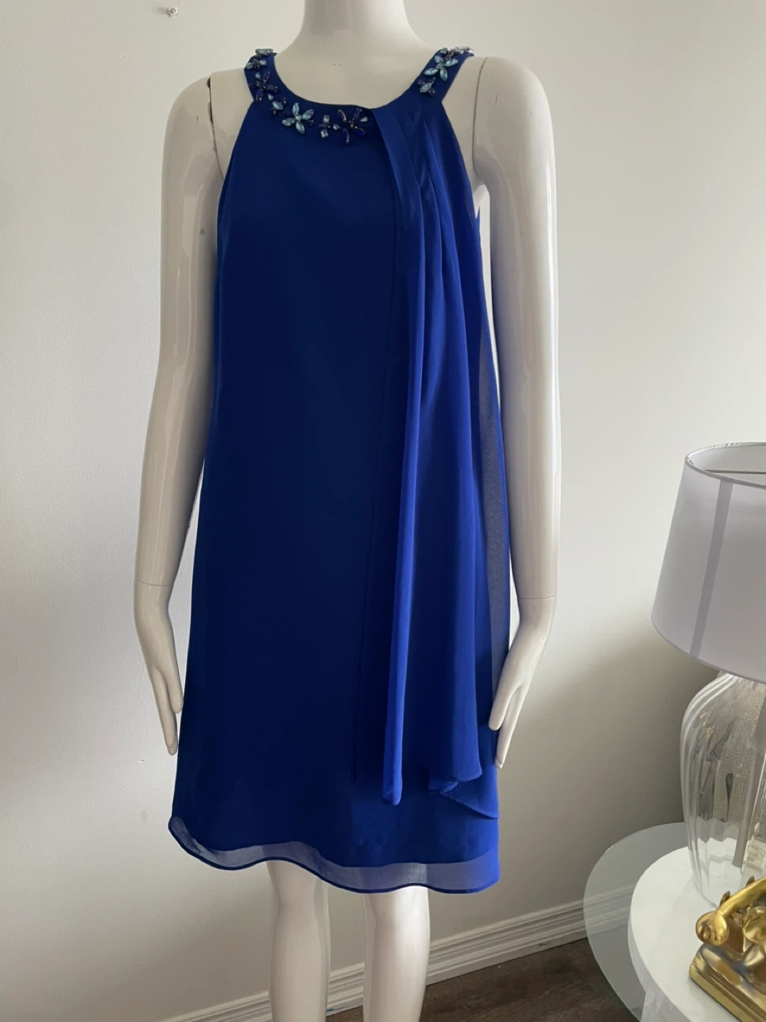 This royal blue dress features a stunning beaded halter neckline with blue and clear gem accents. It has a flowing chiffon overlay on the skirt. Dress it up for a special occasion!