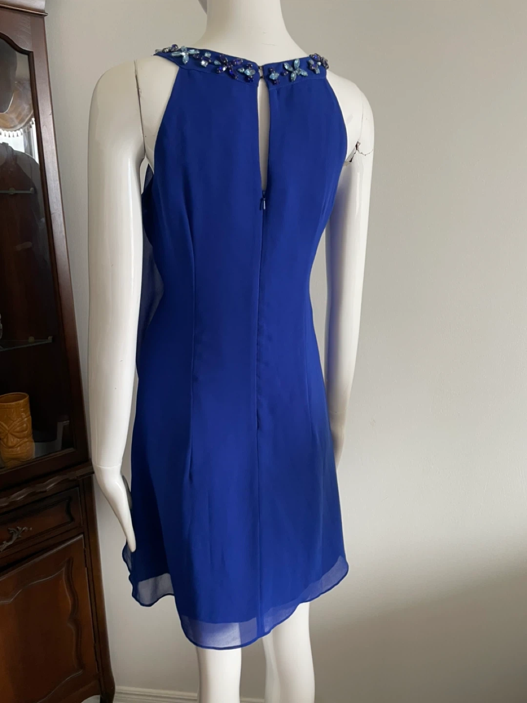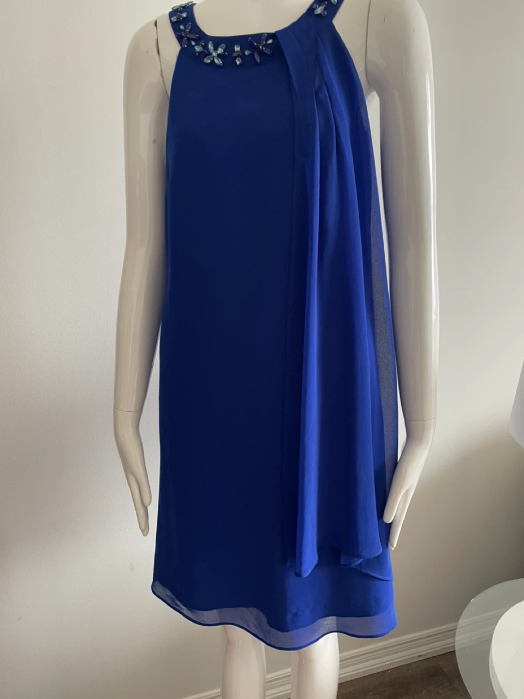This royal blue dress features a stunning beaded halter neckline with blue and clear gem accents. It has a flowing chiffon overlay on the skirt. Dress it up for a special occasion!