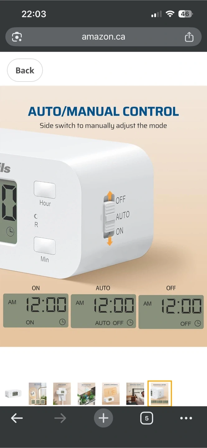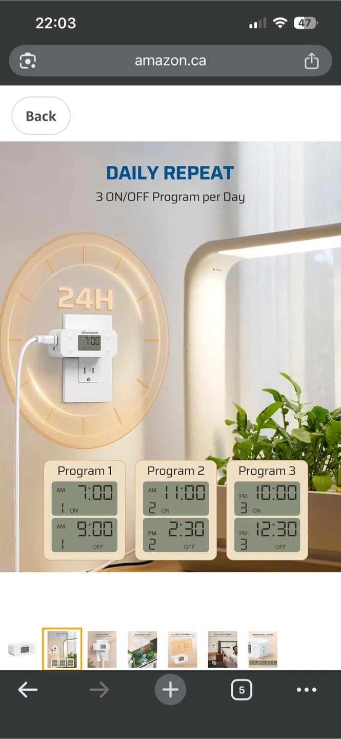 This Dewenwils digital timer plug lets you set up to 3 on/off programs per day. It has a daily repeat function and auto/manual control. The slim design saves space and won't block other outlets.