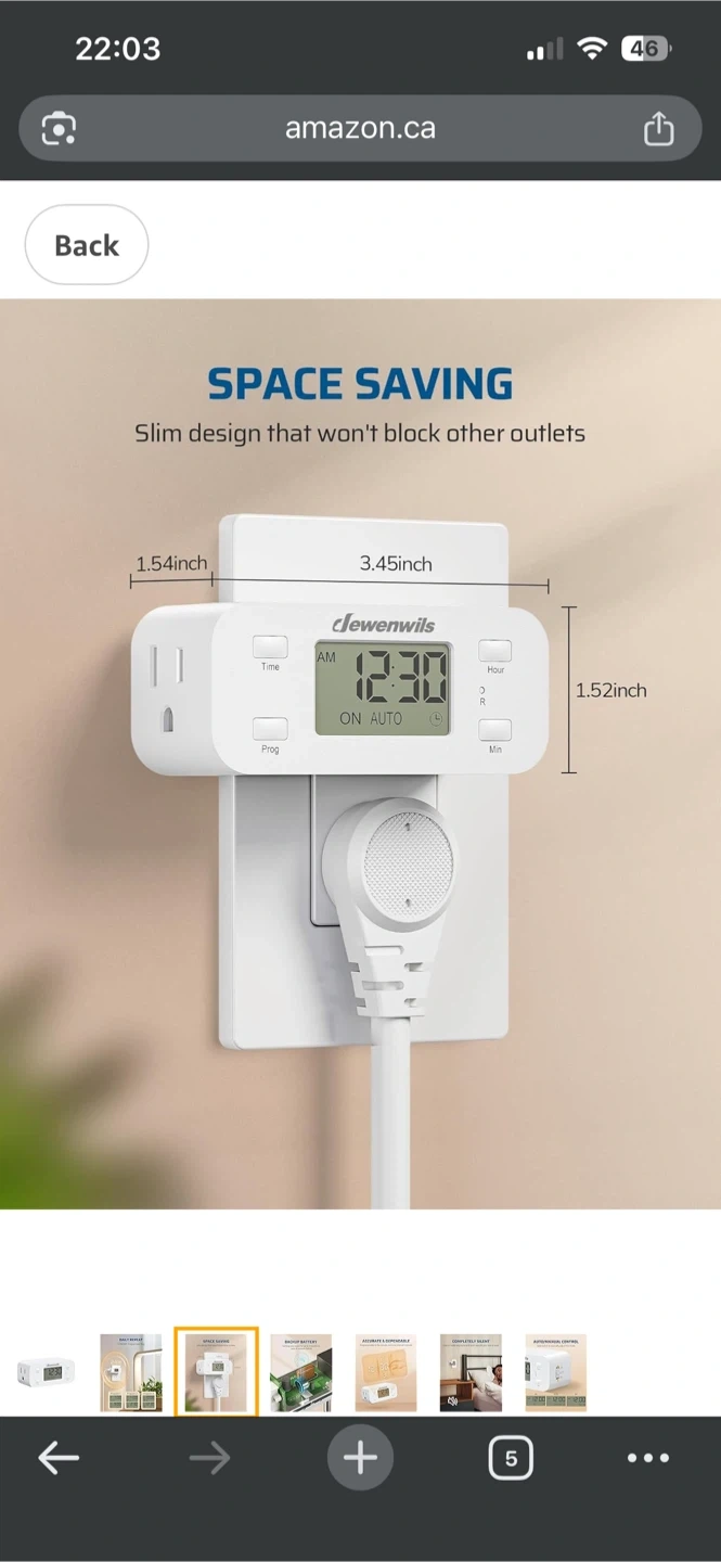 This Dewenwils digital timer plug lets you set up to 3 on/off programs per day. It has a daily repeat function and auto/manual control. The slim design saves space and won't block other outlets.