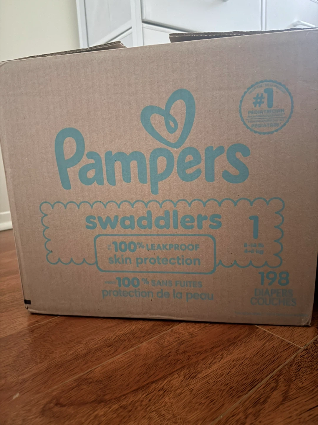 Pampers Swaddlers diapers in size 1. Includes 198 diapers. They offer 100% leakproof skin protection. This is a bulk box of diapers. Brand new in box. $30