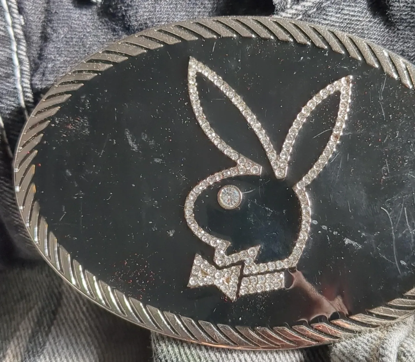 Shiny black belt buckle with a silver-toned border. It features the iconic Playboy bunny logo outlined in clear rhinestones. A single clear rhinestone is placed as the bunny's eye. Made with a metal alloy and encrusted with faux gems.