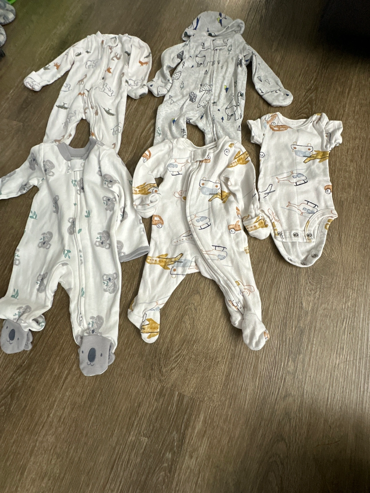 A bundle of baby clothes with various patterns and styles. Koala print sleepwear is new and others like new all for $10