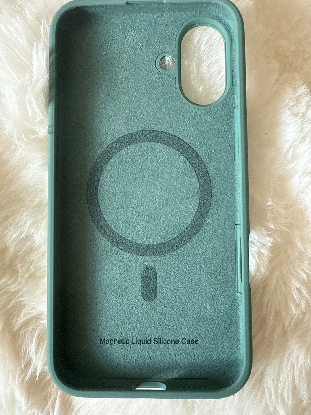 This magnetic liquid silicone case has a cute embossed dinosaur design on the outside. It's made of soft silicone and has a textured interior. The case supports MagSafe charging.