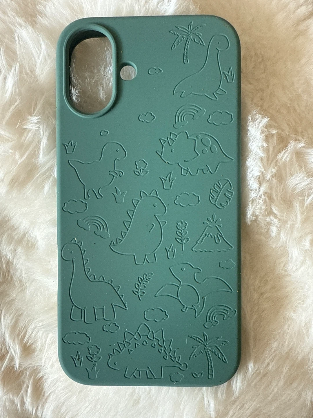 This magnetic liquid silicone case has a cute embossed dinosaur design on the outside. It's made of soft silicone and has a textured interior. The case supports MagSafe charging.