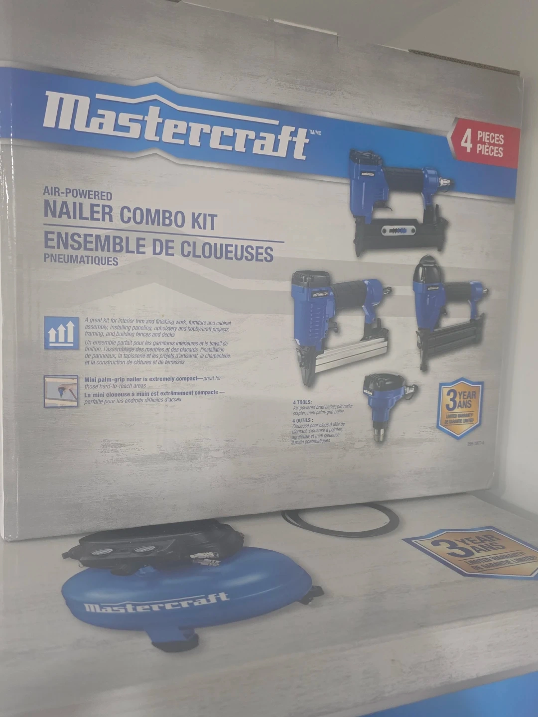 This Mastercraft air-powered nailer combo kit includes 4 tools: a brad nailer, pin nailer, stapler, and mini palm-grip nailer. It's great for interior trim, furniture assembly, and framing projects. The mini palm-grip nailer is extremely compact for hard-to-reach areas.