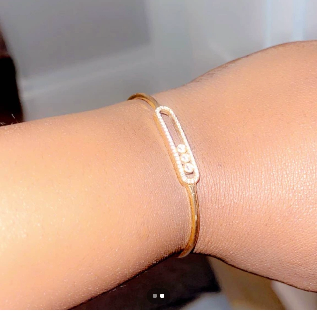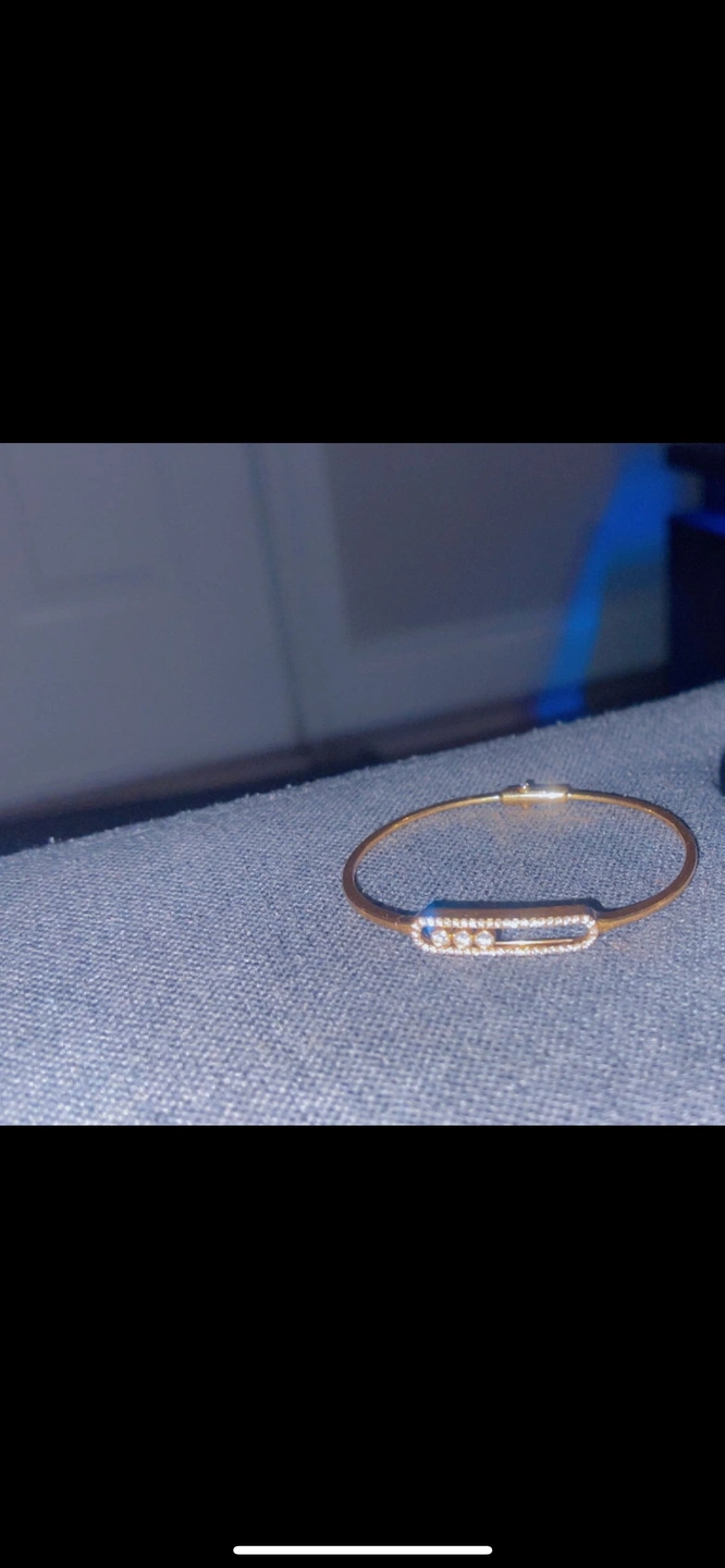 A rose gold bracelet with three clear stones set in a rectangular design.Am selling off at a very good price because the worth of it is $9400