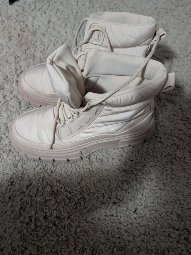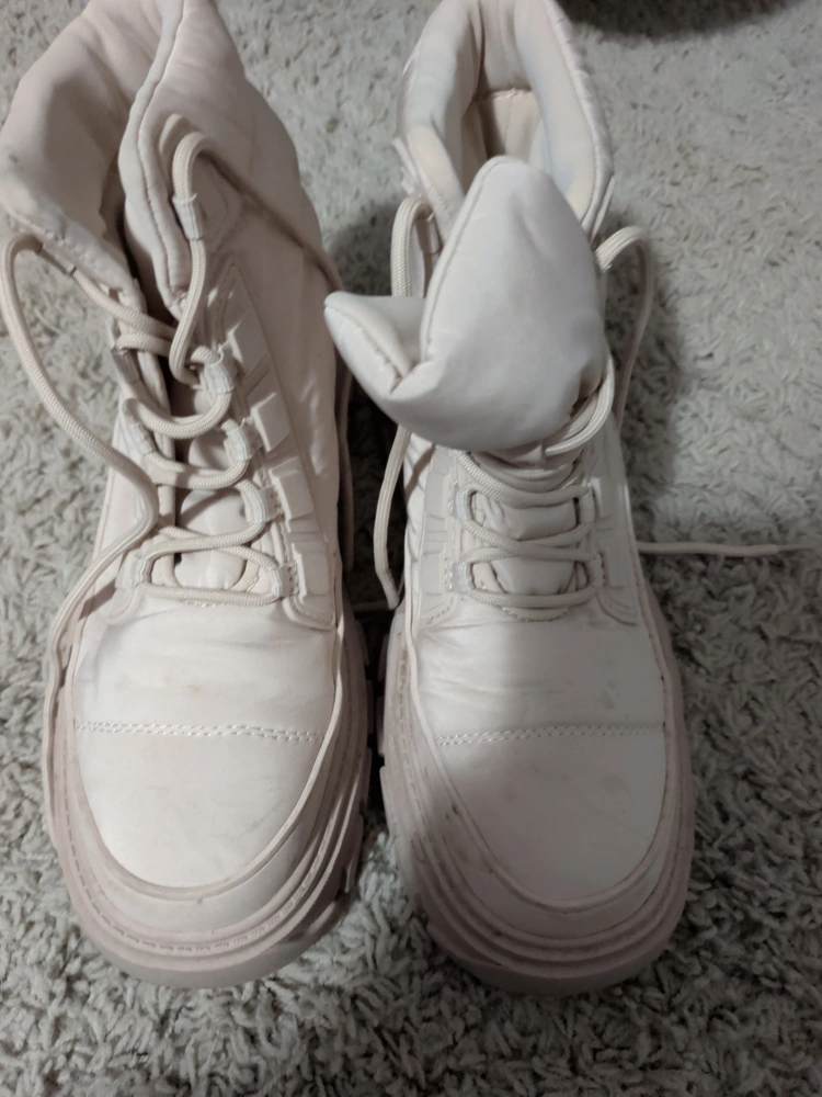 Selling a pair of MNG padded boots! They're in great condition and are a women's size 10. The boots are a light beige colour and feature a unique padded design. Perfect for adding a stylish touch to your outfits!