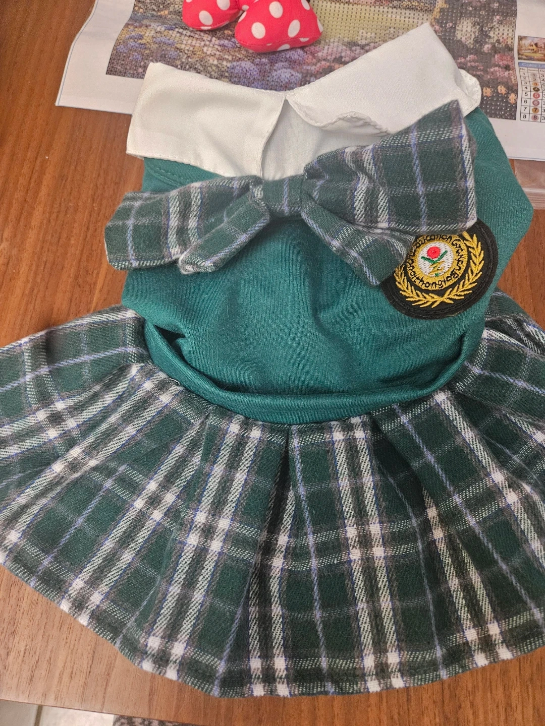 This adorable dog dress features a classic green plaid pattern. It has a comfortable fit with a stylish white collar. It's perfect for dressing up your furry friend! S size