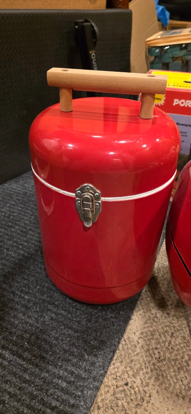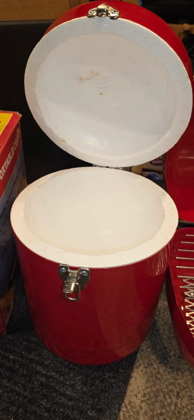 This is a red portable cooker or grill and cooler. It's a compact size perfect for small outdoor gatherings. Metal construction with wooden handles. Includes grill grate. Cooler with Styrofoam inside.