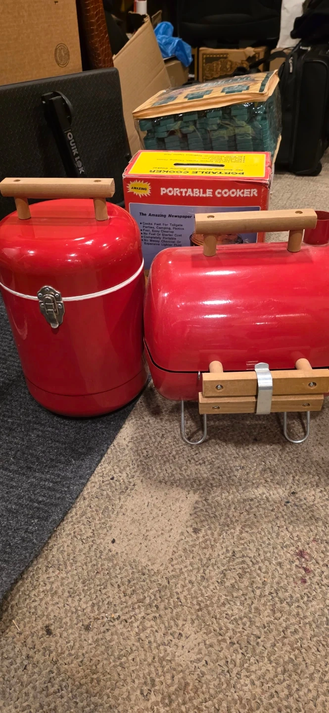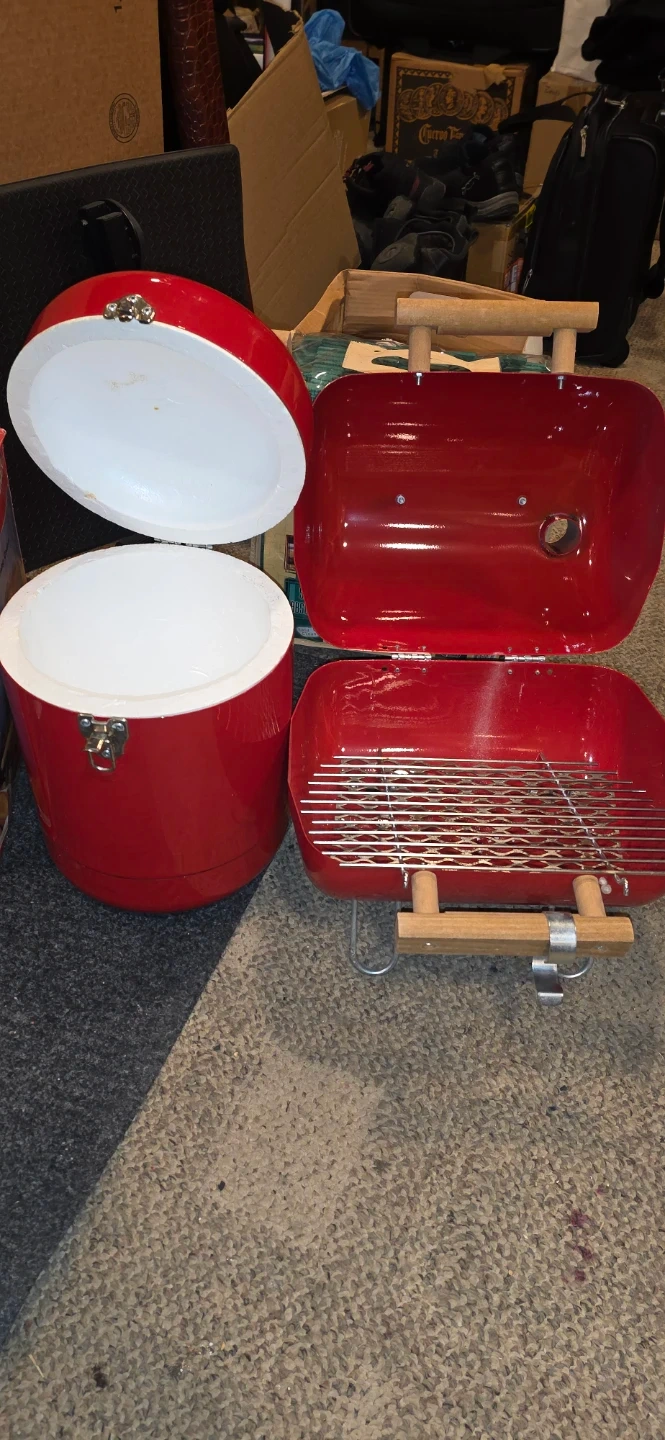 This is a red portable cooker or grill and cooler. It's a compact size perfect for small outdoor gatherings. Metal construction with wooden handles. Includes grill grate. Cooler with Styrofoam inside.