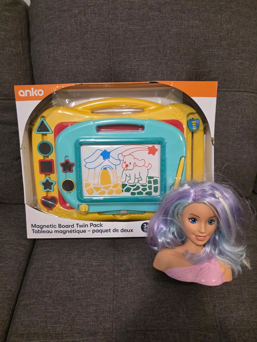 This is an Anko Magnetic Board Twin Pack, perfect for little artists. It includes stamps in various shapes for creative fun. Recommended for ages 3 and up. Plus Barbie