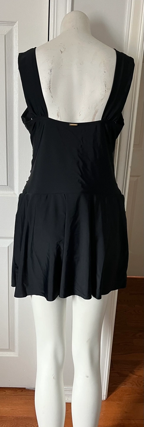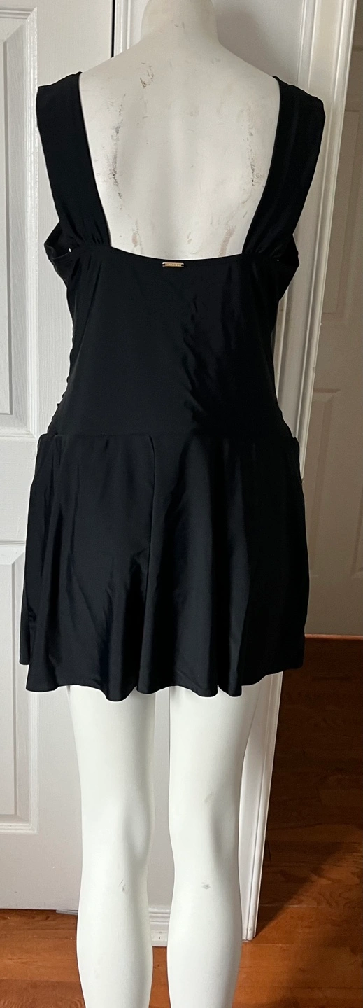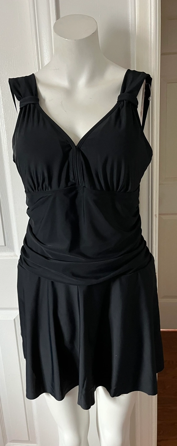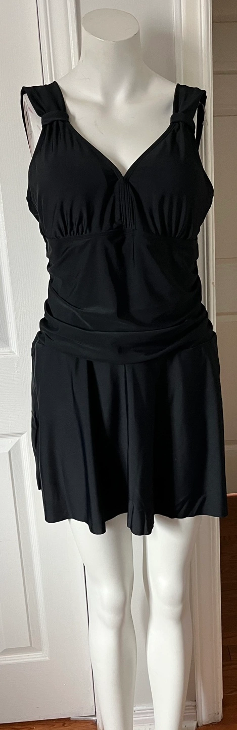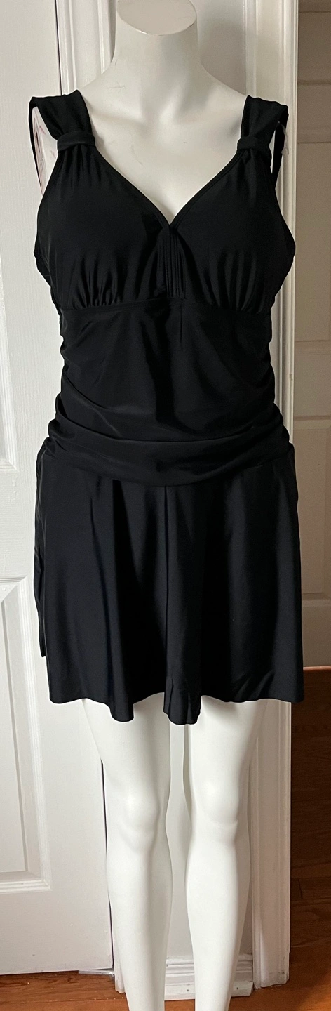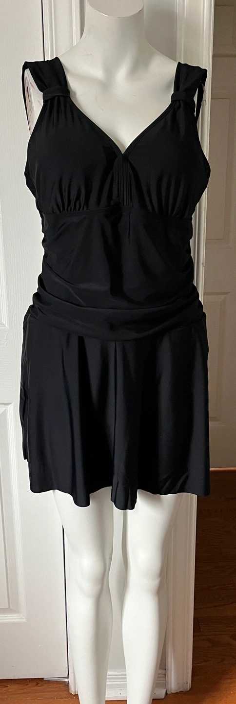 Black swim dress, V-neckline, skirted bottom. Shoulder straps with a knot detail. Looks to be new or gently used.