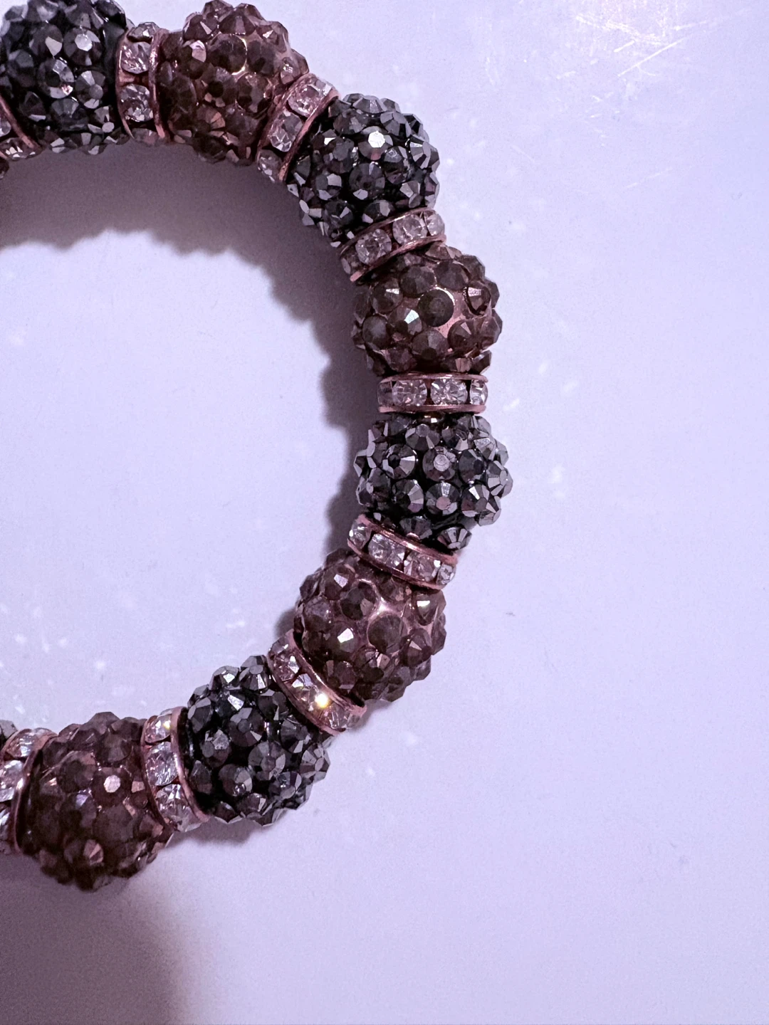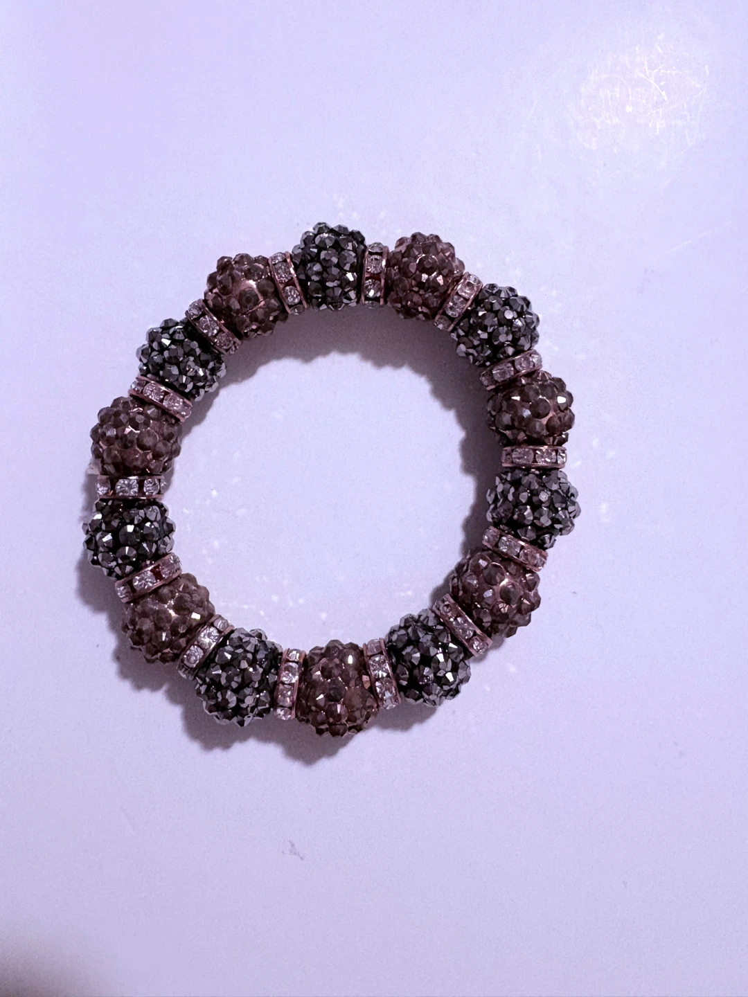 This stretchy bracelet features a mix of brown and grey sparkly beads. Small clear rhinestones are interspersed between the larger beads. It's an eye-catching accessory!