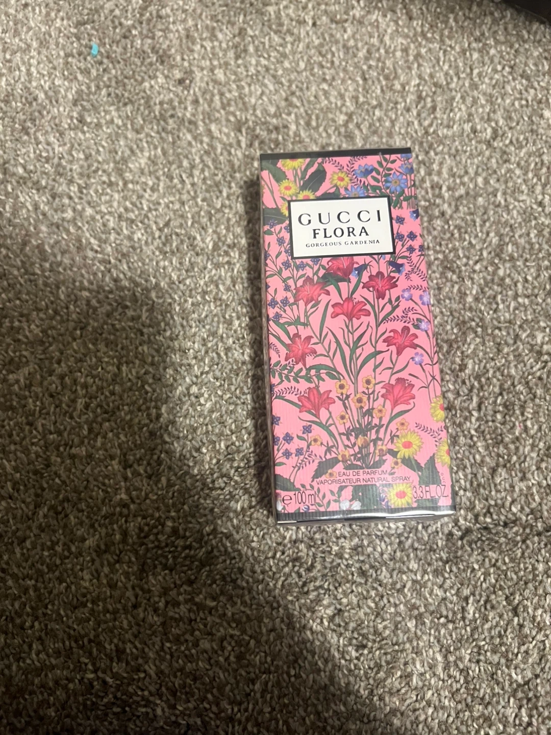Gucci Flora Gorgeous Gardenia Eau de Parfum. A floral fragrance with notes of White Gardenia, Jasmine Grandiflorum, and Pear Blossom. Includes original box and the 3.3 oz (100ml) spray bottle. This scent is perfect for everyday wear.