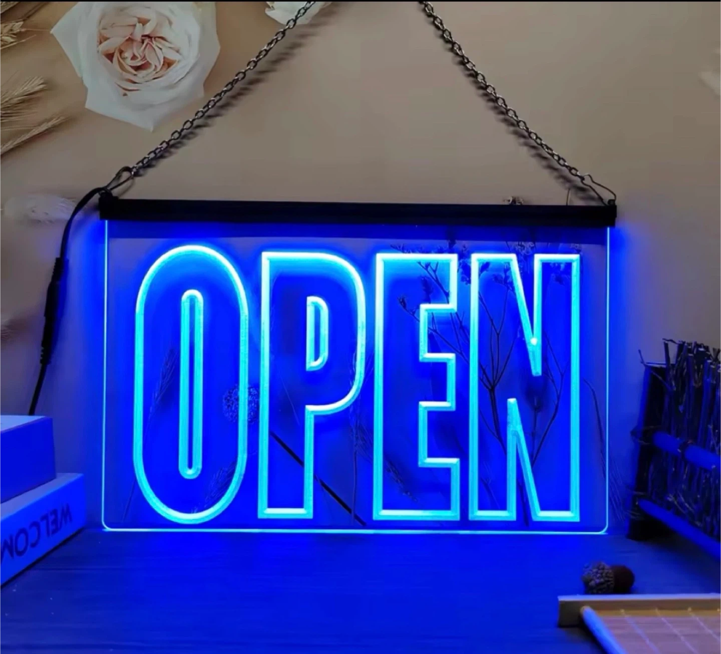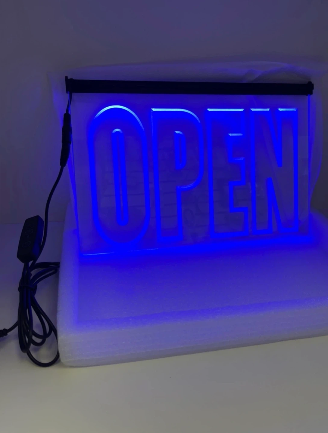 This bright blue LED "OPEN" sign is perfect for businesses wanting to attract customers. It comes with a power adapter and hanging chain. The sign is illuminated by vibrant blue LEDs, making it highly visible.