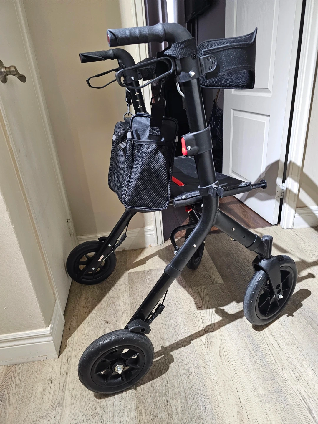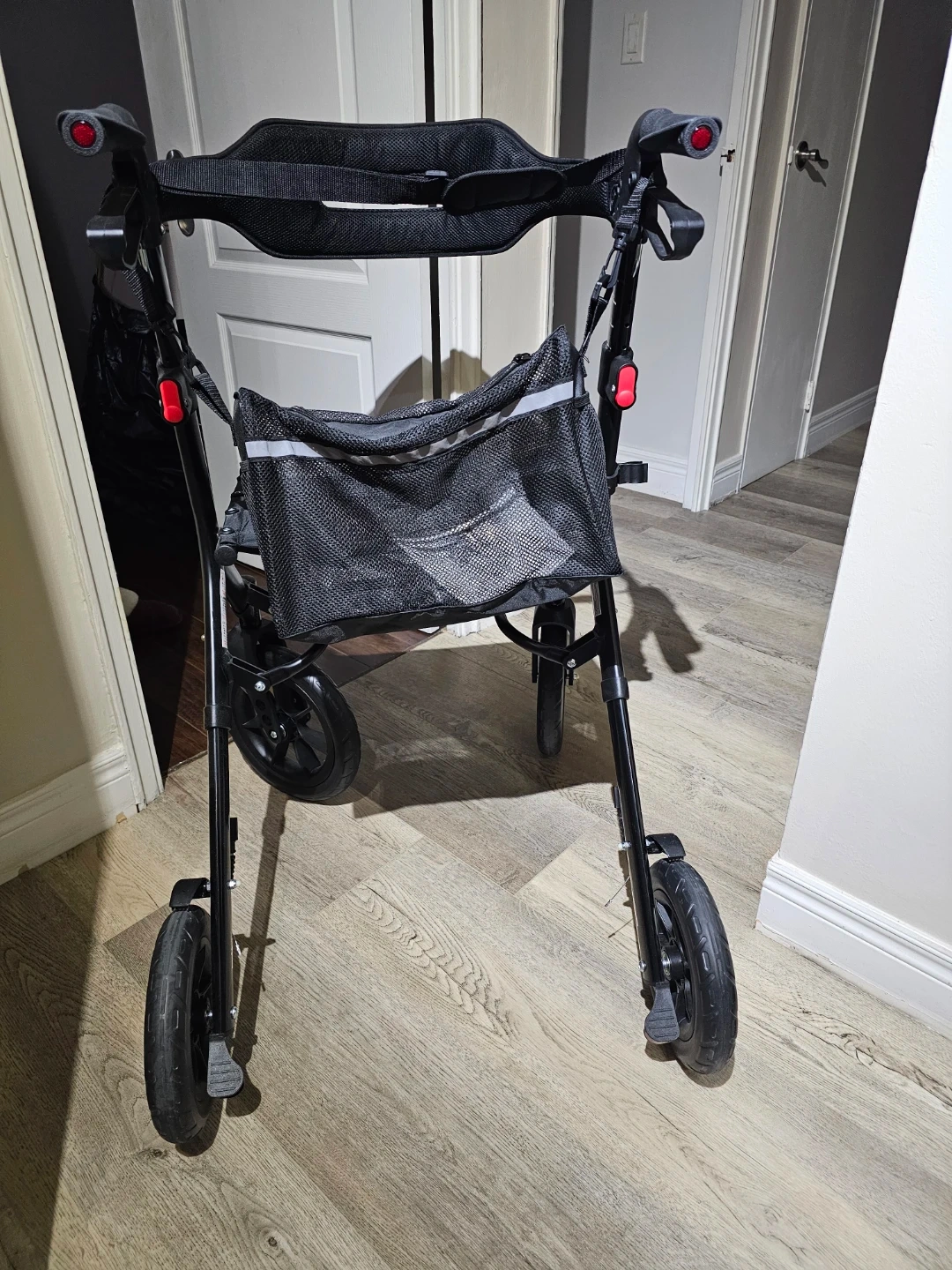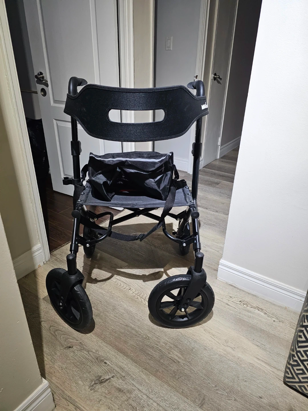 This is a MAXWALK rollator walker. It features a seat and a storage bag. This walker is designed for stability and mobility assistance. Used twice in an indoor hallway of home.