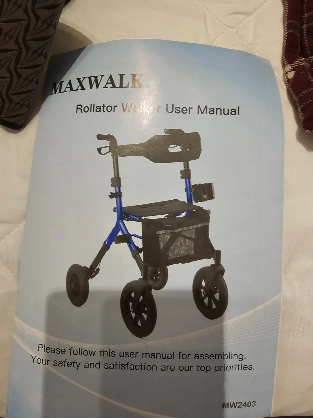This is a MAXWALK rollator walker. It features a seat and a storage bag. This walker is designed for stability and mobility assistance. Used twice in an indoor hallway of home.