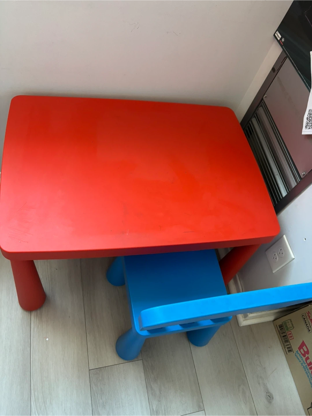 This is an IKEA red children's table and a blue child's chair. They're made of plastic and are perfect for little ones' play or craft time. The table has some minor scuffs. The chair is sturdy and comfortable.