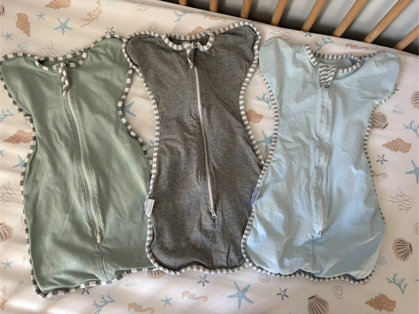 This is a 3-pack of Love to Dream Swaddle UP Transition Bags. They come in sage green, grey, and light blue. The bags are made of a soft, breathable fabric.