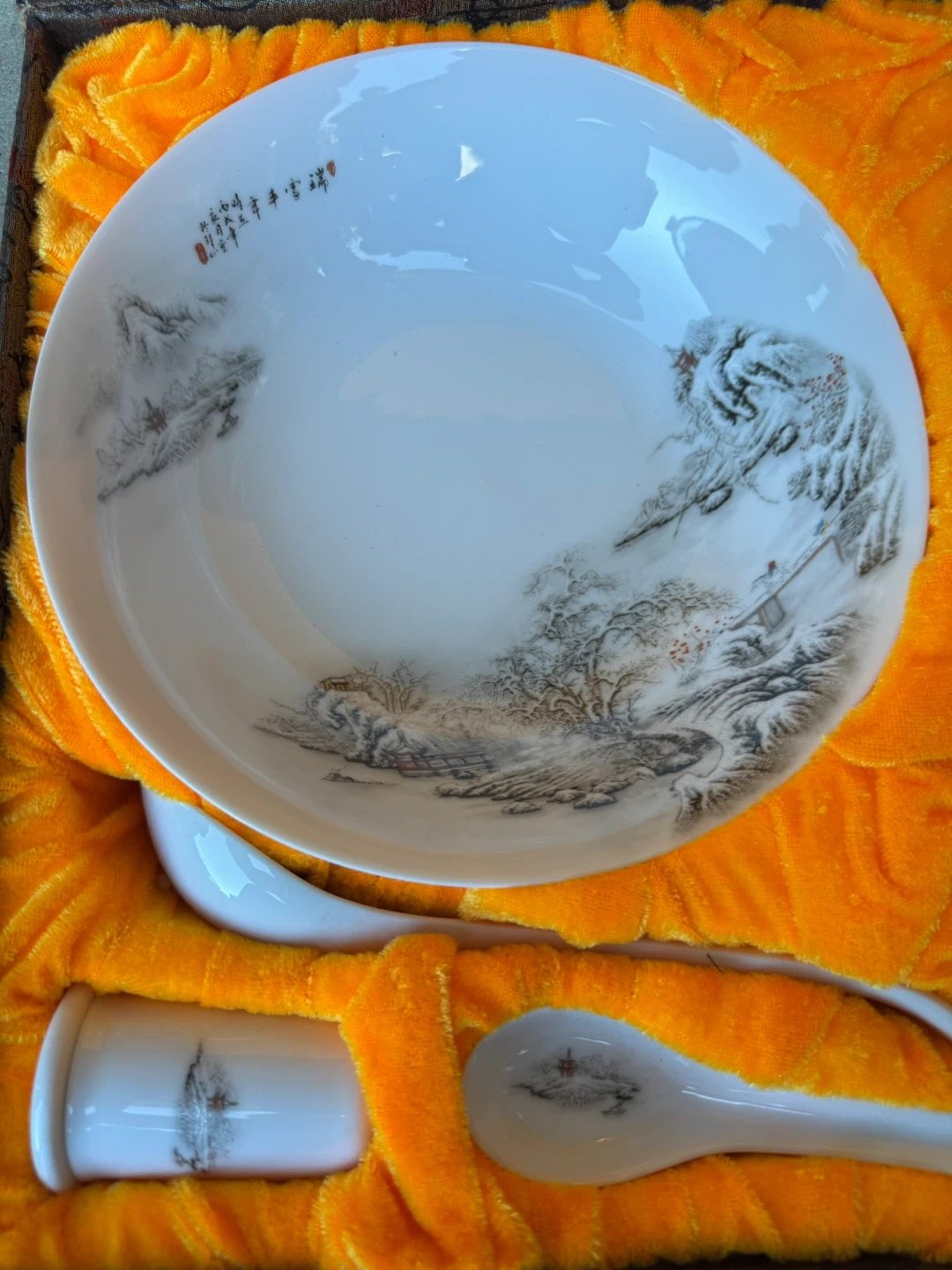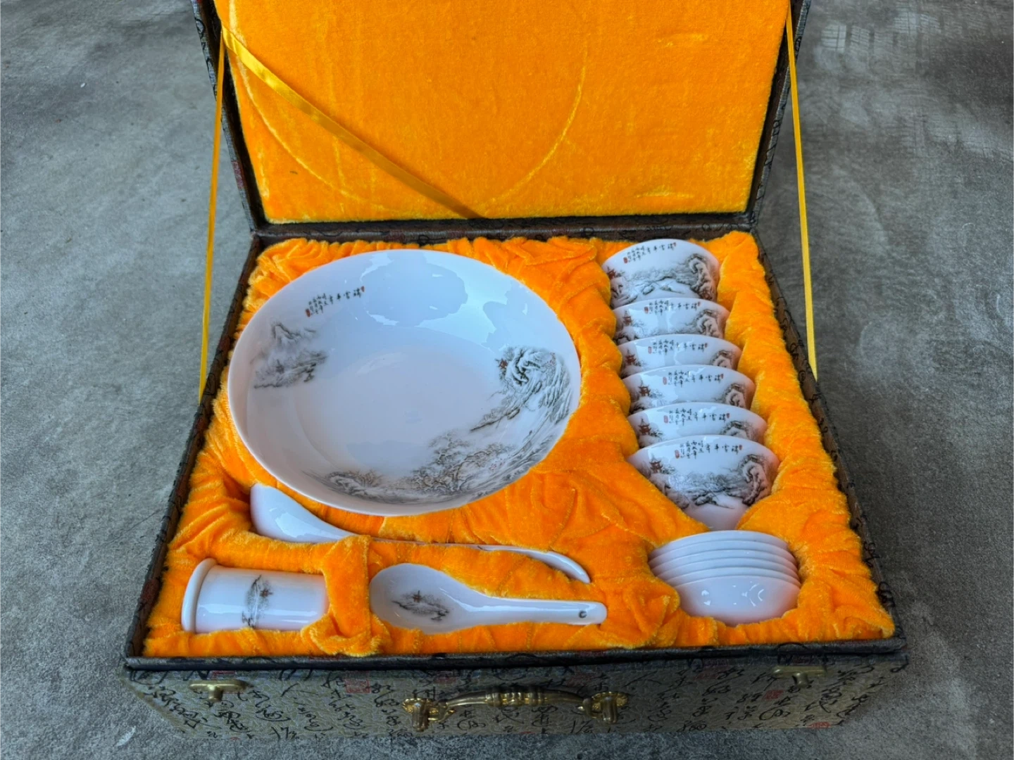 This is a ceramic tea set from the Beijing 2008 Olympics. It includes a large serving bowl, six small tea bowls, two spoons, and two small dishes. The set comes in a decorative presentation case.