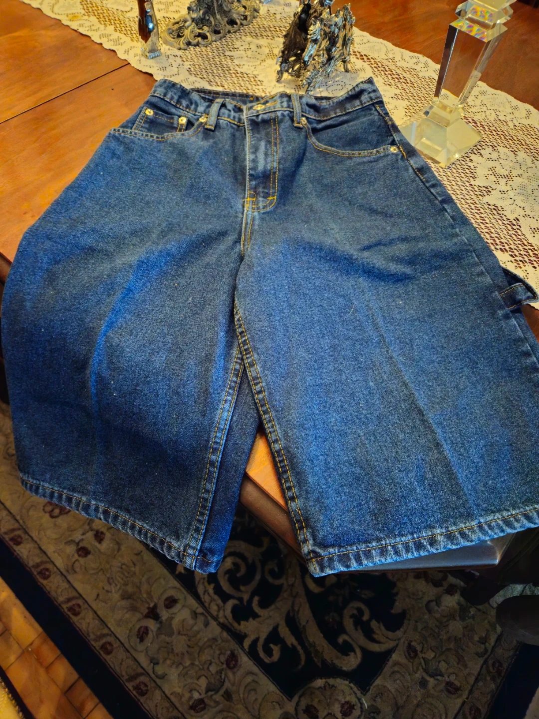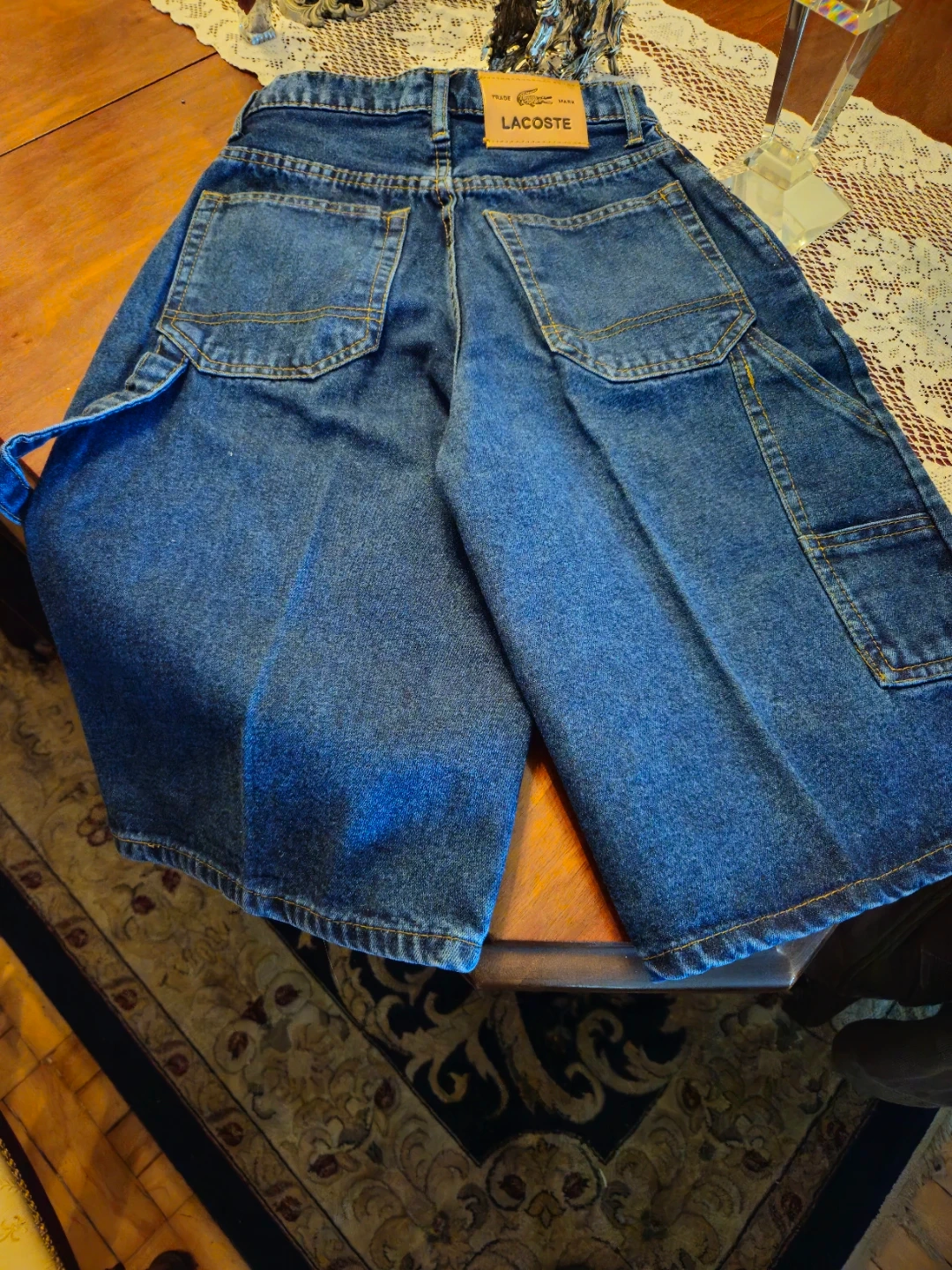 These are blue denim carpenter shorts from Lacoste. They're made of sturdy denim material. Perfect for a casual day out!